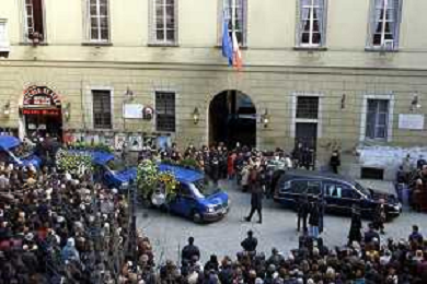 milano 03/01/03 piccolo teatro di via rovello dove è stata allestita la camera ardente per la morte di giorgio gaber nella foto feretro portato aspalla attraverso la folla foto mario romano/ag. aldo liverani
