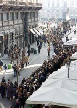 milano 03/01/03 piccolo teatro di via rovello dove è stata allestita la camera ardente per la morte di giorgio gaber nella foto la folla in coda davanti la camera ardente foto mario romano/ag. aldo liverani