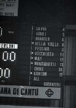 NEG-1985-1986 CANTU'-CAMPIONATO DI BASKET SERIE A1 AREXONS CANTU'-BERLONI TORINO NELLA FOTO TABELLONE SQUADRA TORINO AG ALDO LIVERANI SAS