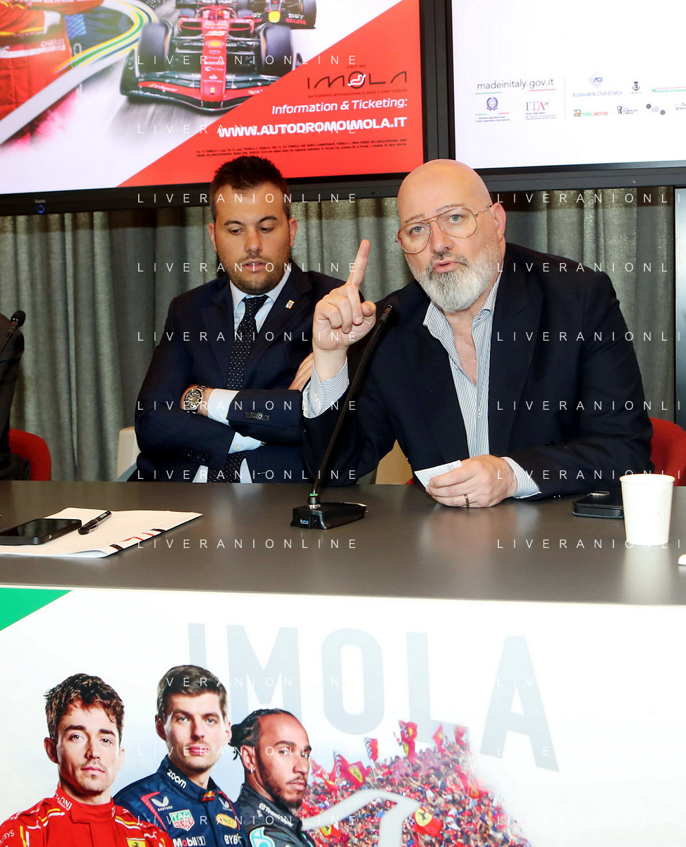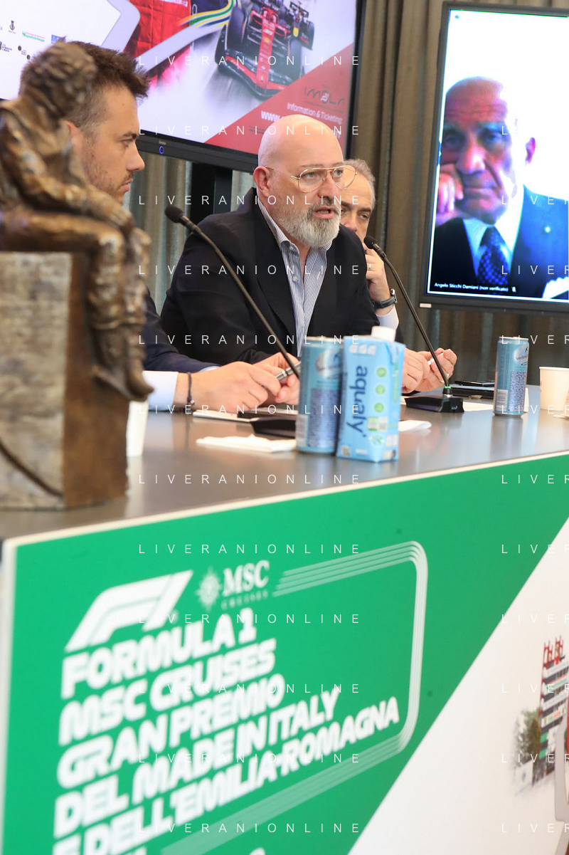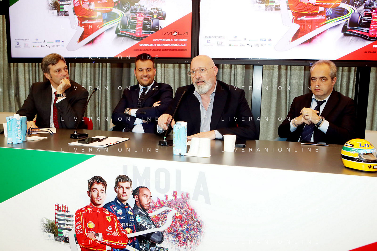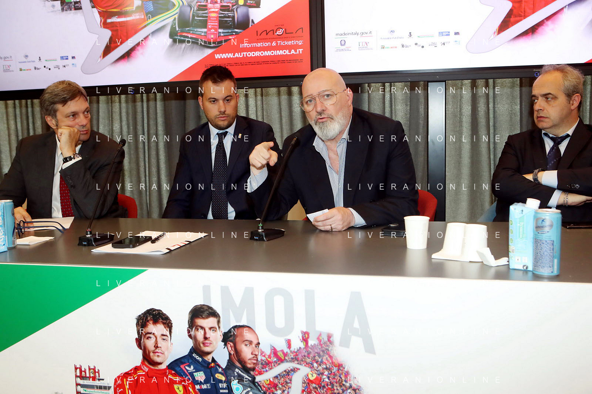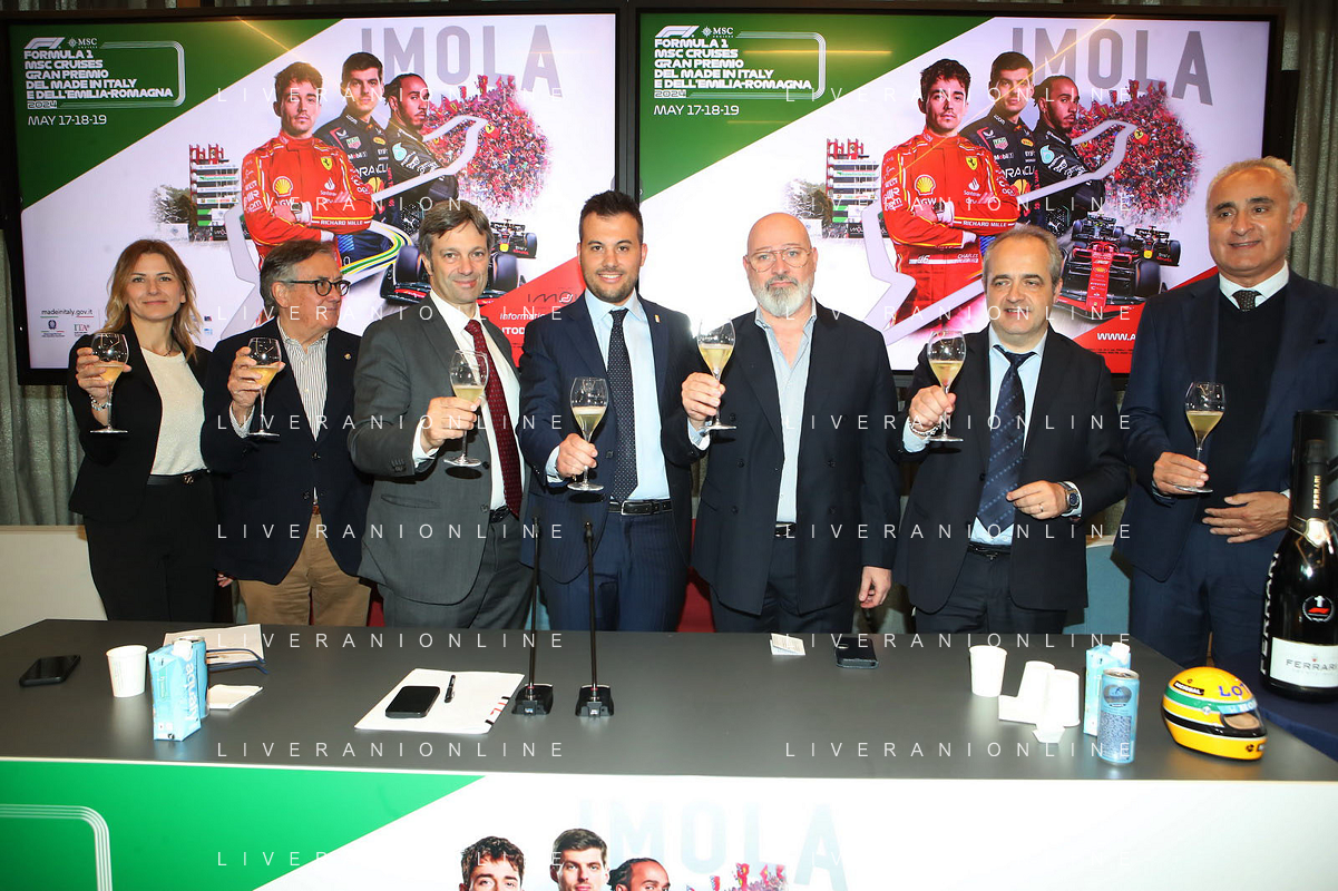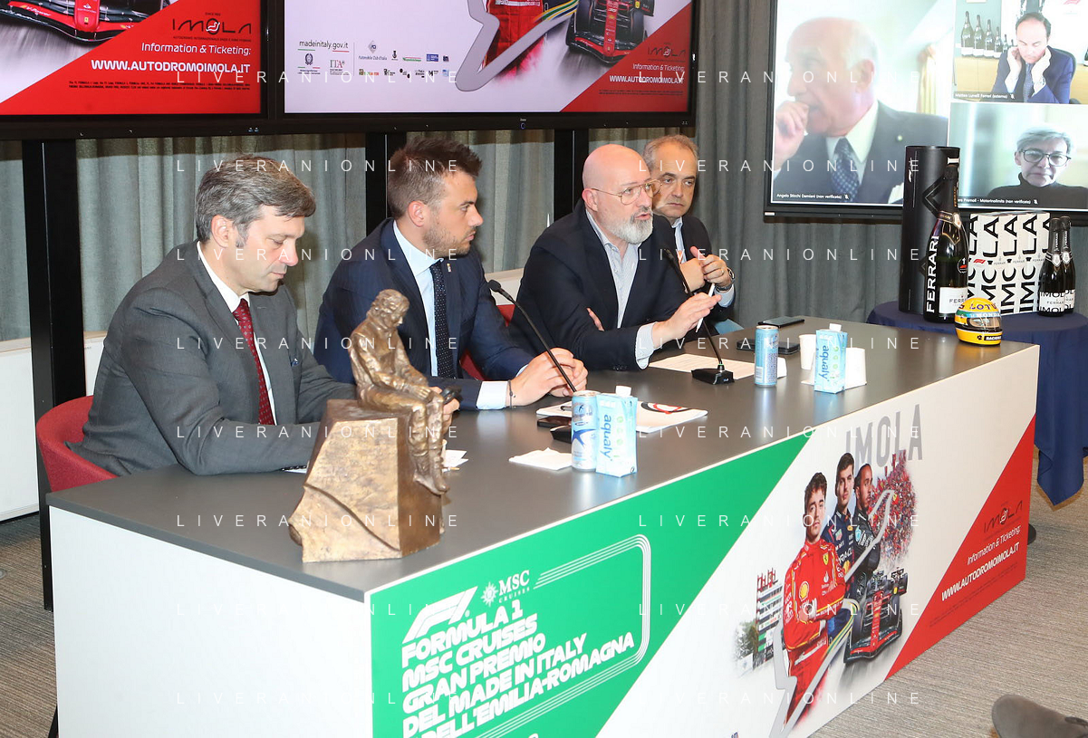 BOLOGNA 09 05 2024 REGIONE EMILIA-ROMAGNA CONFERENZA STAMPA DI PRESENTAZIONE "FORMULA1 MSC CRUISES GRAN PREMIODEL MADE IN ITALY E DELL'EMILIA-ROMAGNA NELLA FOTO DA SINISTRA ASSESSORE ELENA PENAZZI,GIAN CARLO MINARDI PRESIDENTE FORMULA IMOLA, MATTEO ZOPPAS PRESIDENTE AGENZIA ICE,SINDACO DI IMOLA MARCO PANIERI,PRESIDENTE REGIONE EMILIA-ROMAGNA STEFANO BONACCINI E GIAN MARIA MANGHI DELLA REGIONE E FABIO BACCHILEGA PRESIDENTE CON.AMI ©SANNA / AGENZIA ALDO LIVERANI SAS