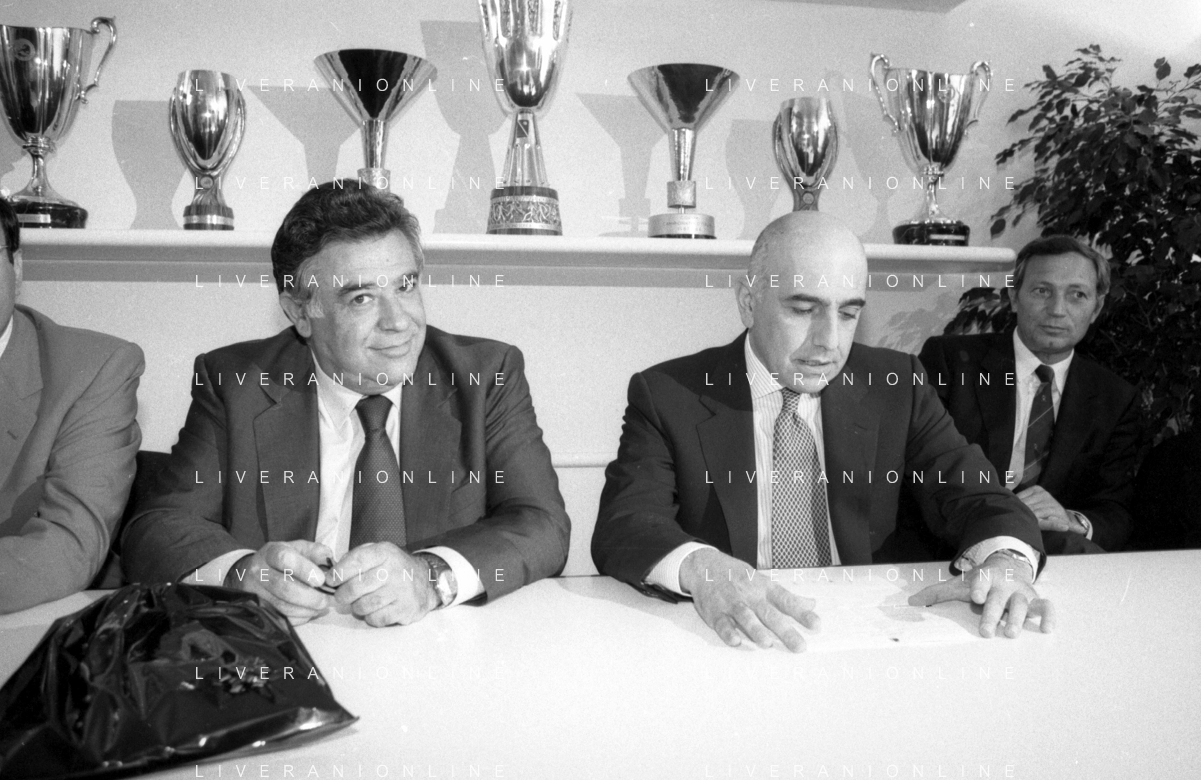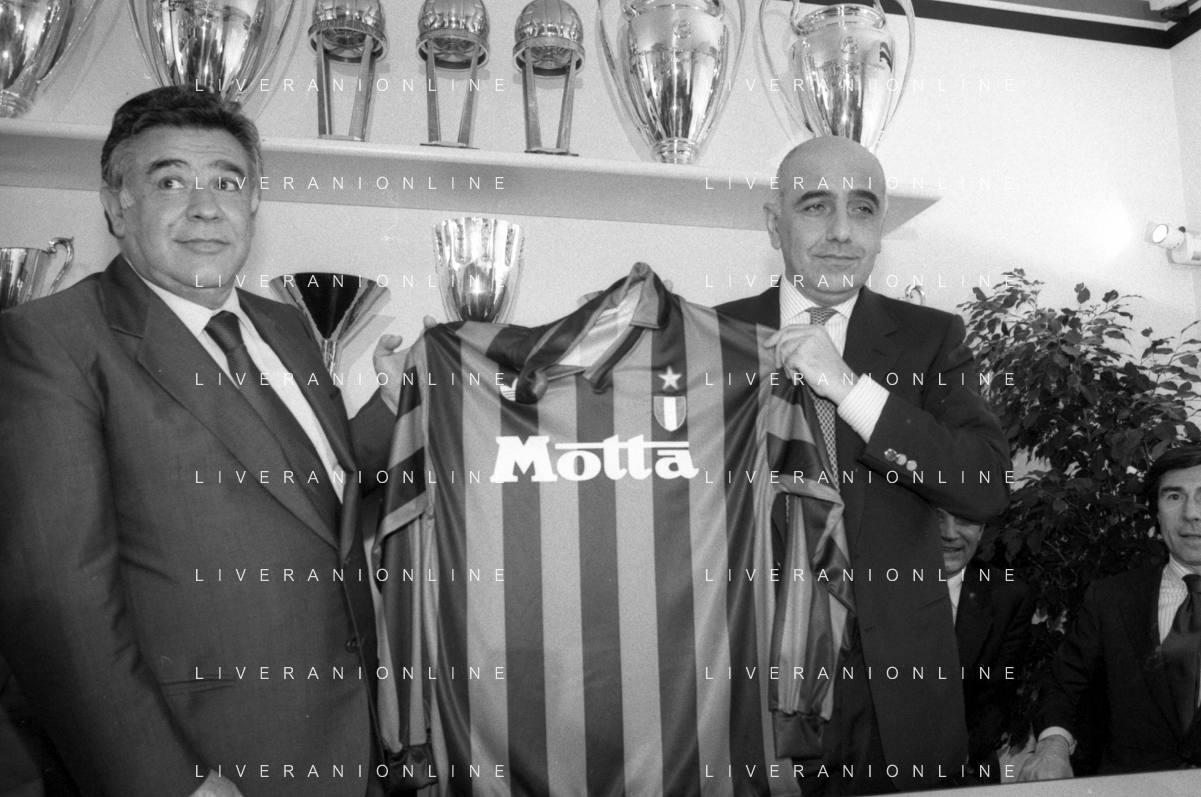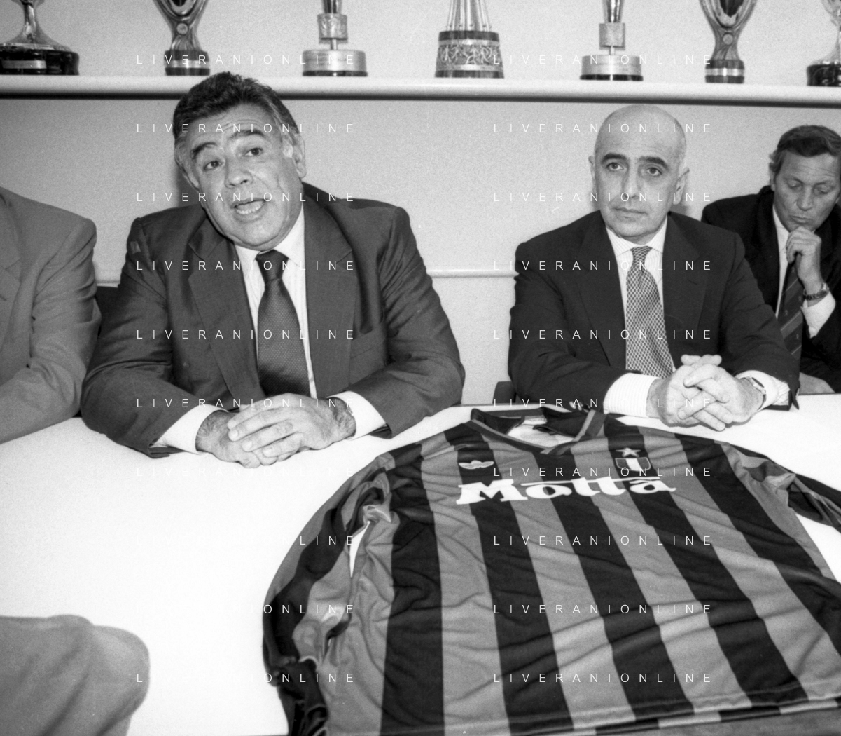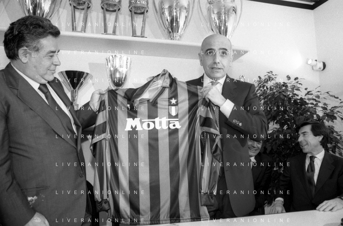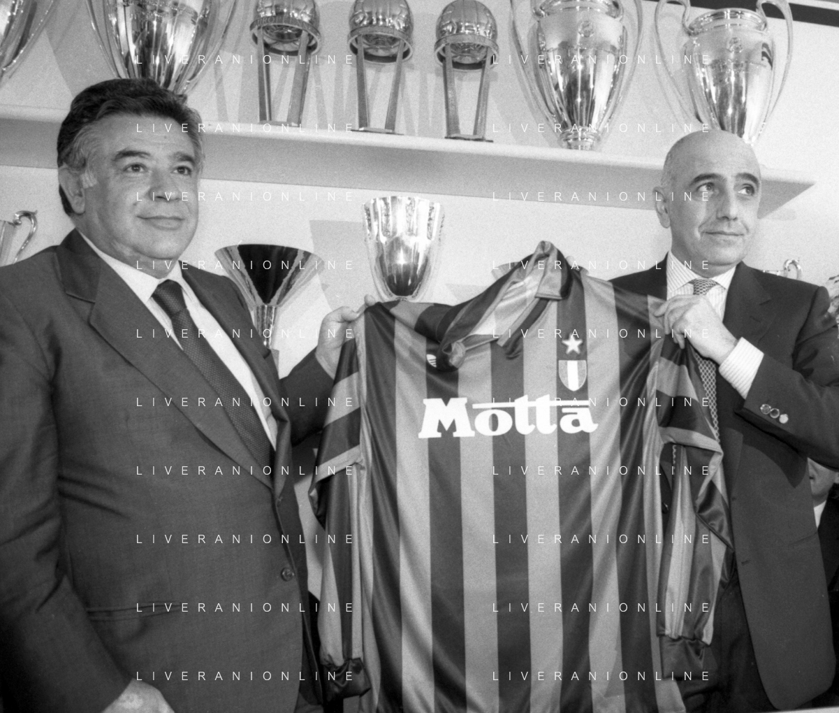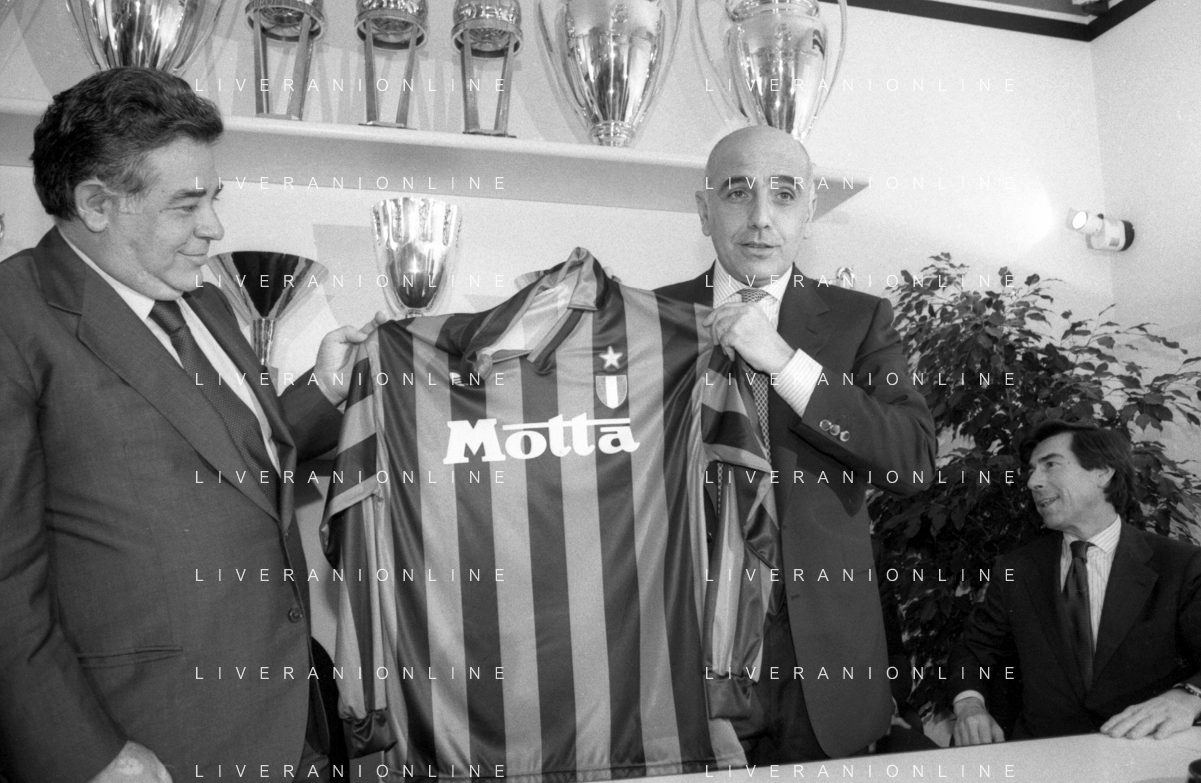Neg- RETROSPETTIVA ADRIANO GALLIANI , Dirigente Sportivo Calcio Nella foto ADRIANO GALLIANI amministratore delegato MILAN CALCIO, ALLA PRESENTAZIONE DELLO SPONSOR 'MOTTA' CAMPIONATO 1992-1993 CON ARIEDO BRAIDA AG ALDO LIVERANI