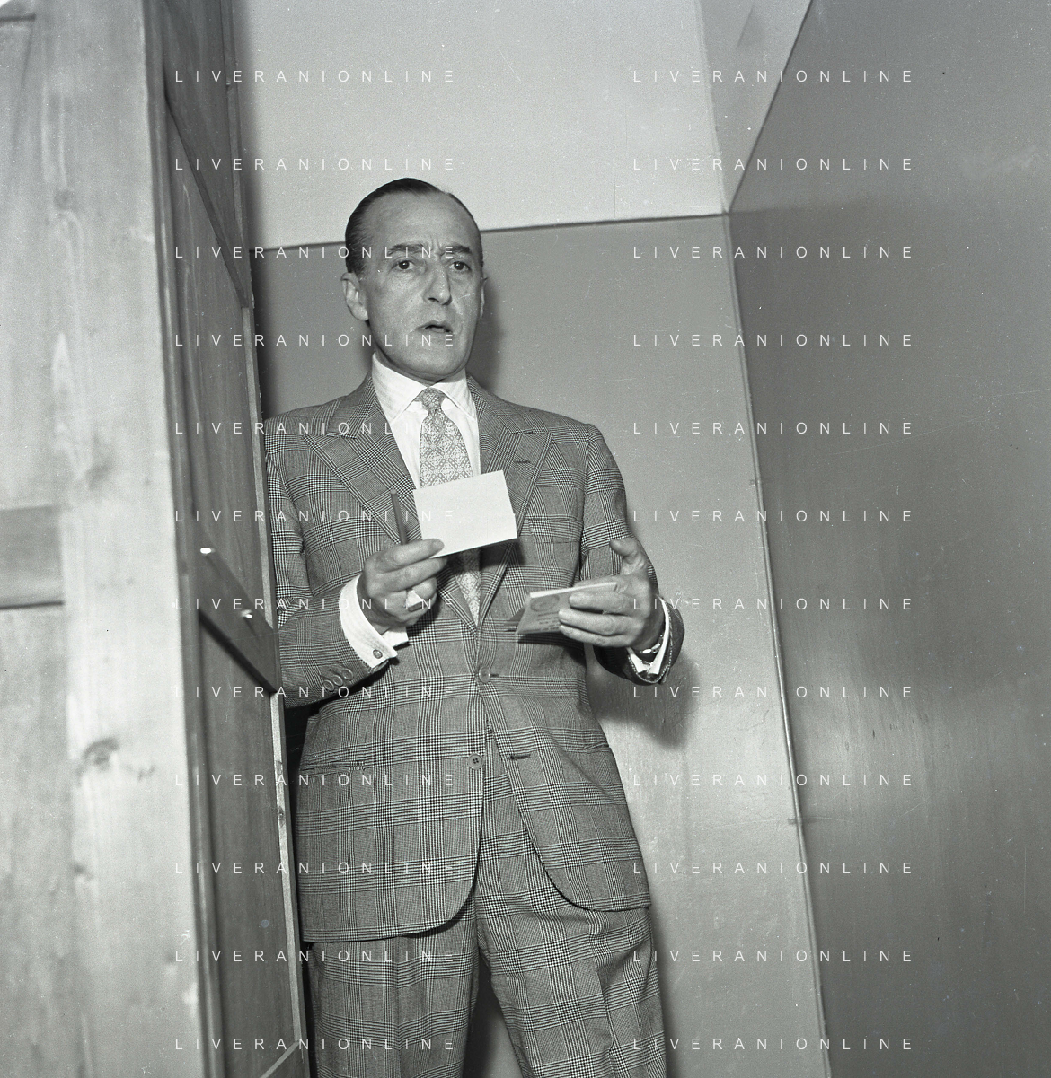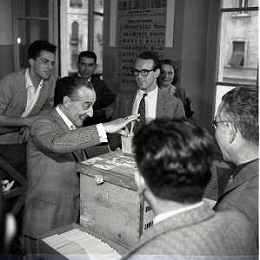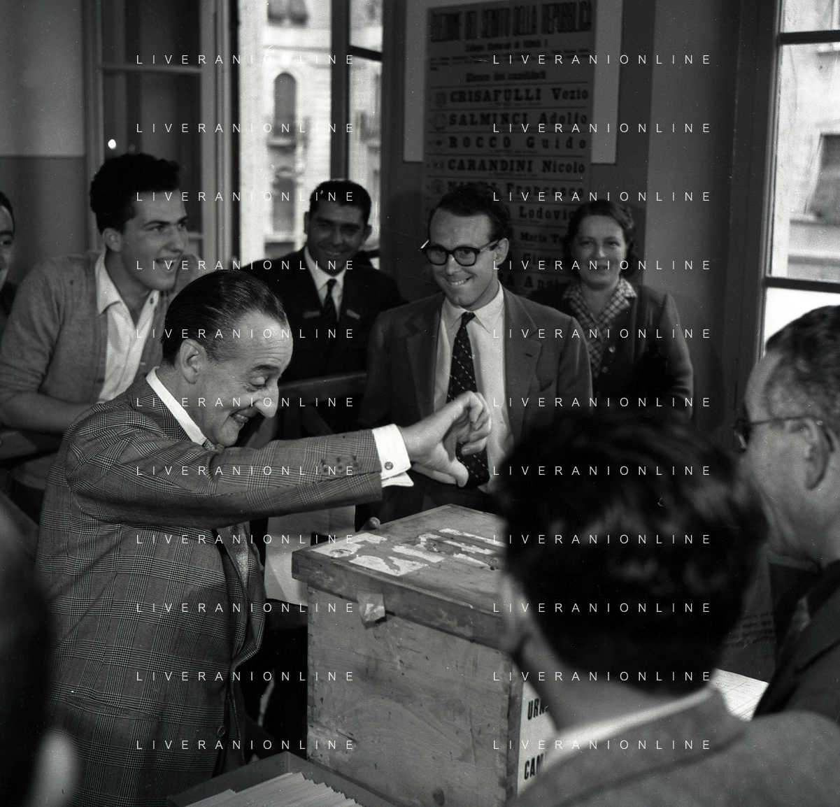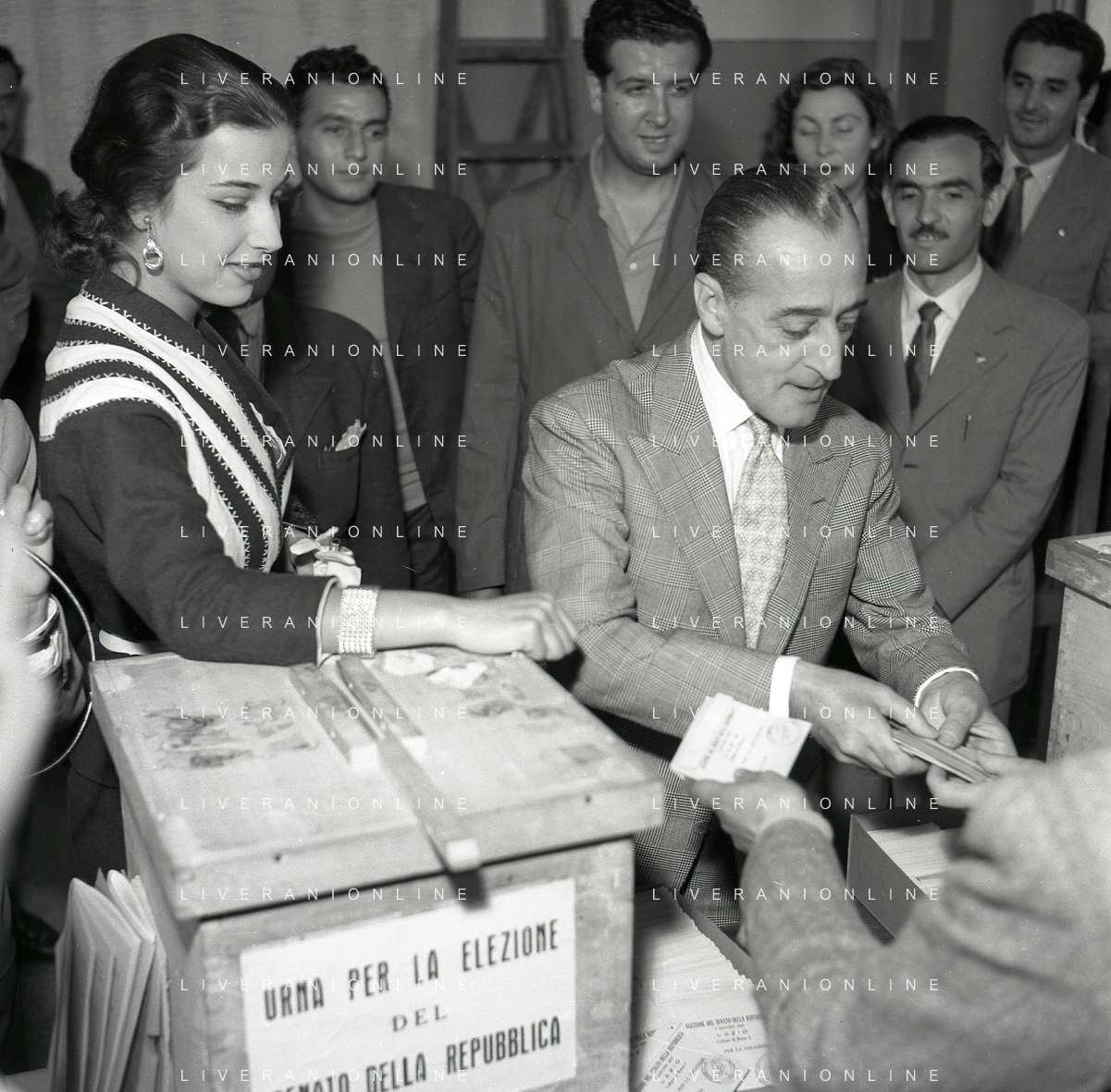 NEG-RETROSPETTIVA ANTONIO DE CURTIS IN ARTE TOTO' NELLA FOTO ANTONIO DE CURTIS IN ARTE TOTO'ALLE URNE PER LE VOTAZIONI CON FRANCA FALDINI A ROMA NELL'ANNO 1953 FOTO SANRO VESPASIANI-AG ALDO LIVERANI SAS