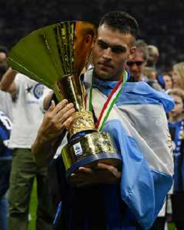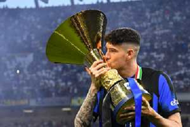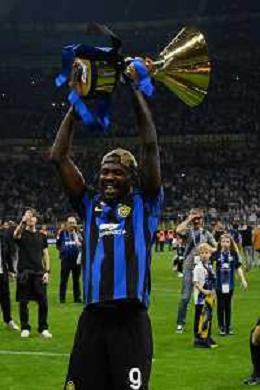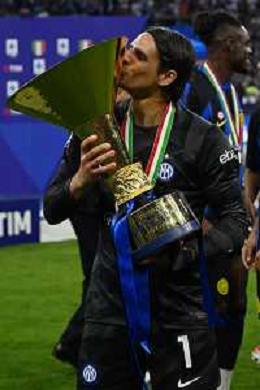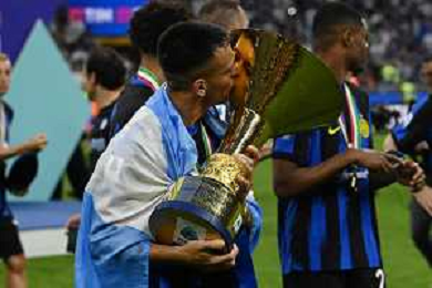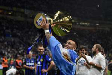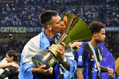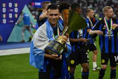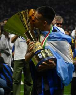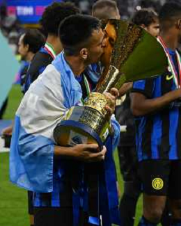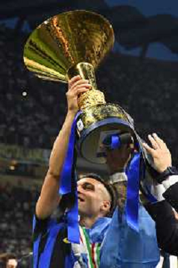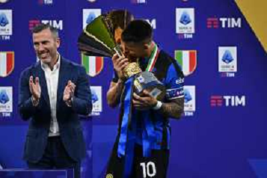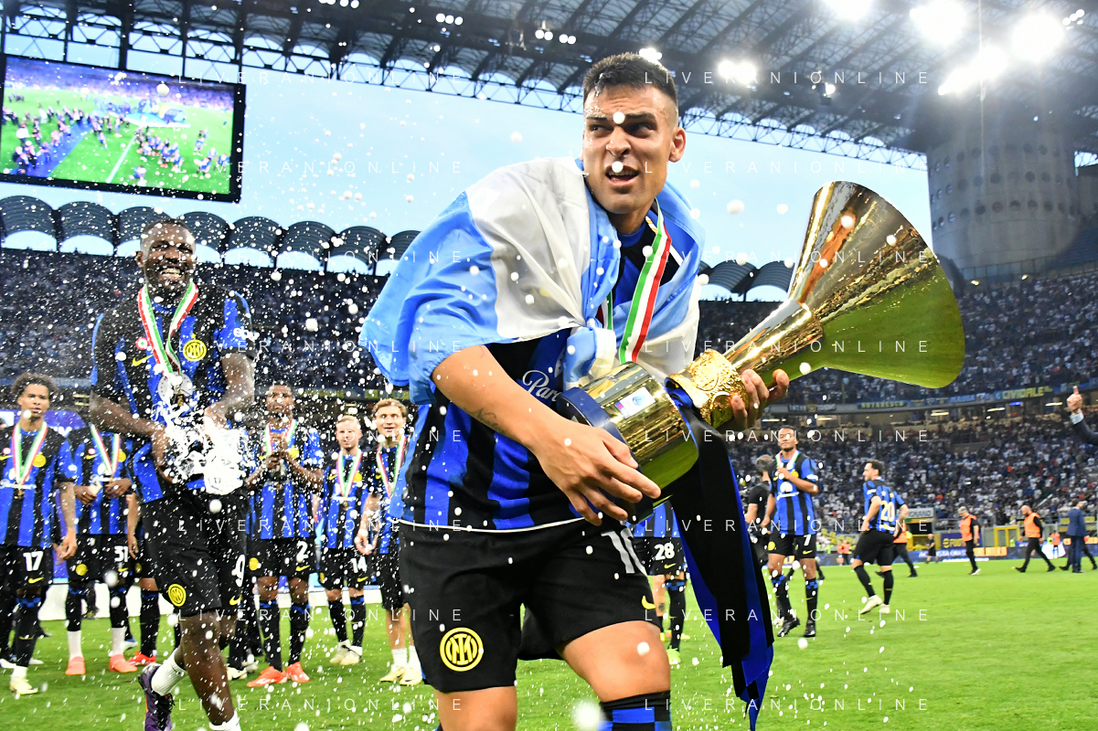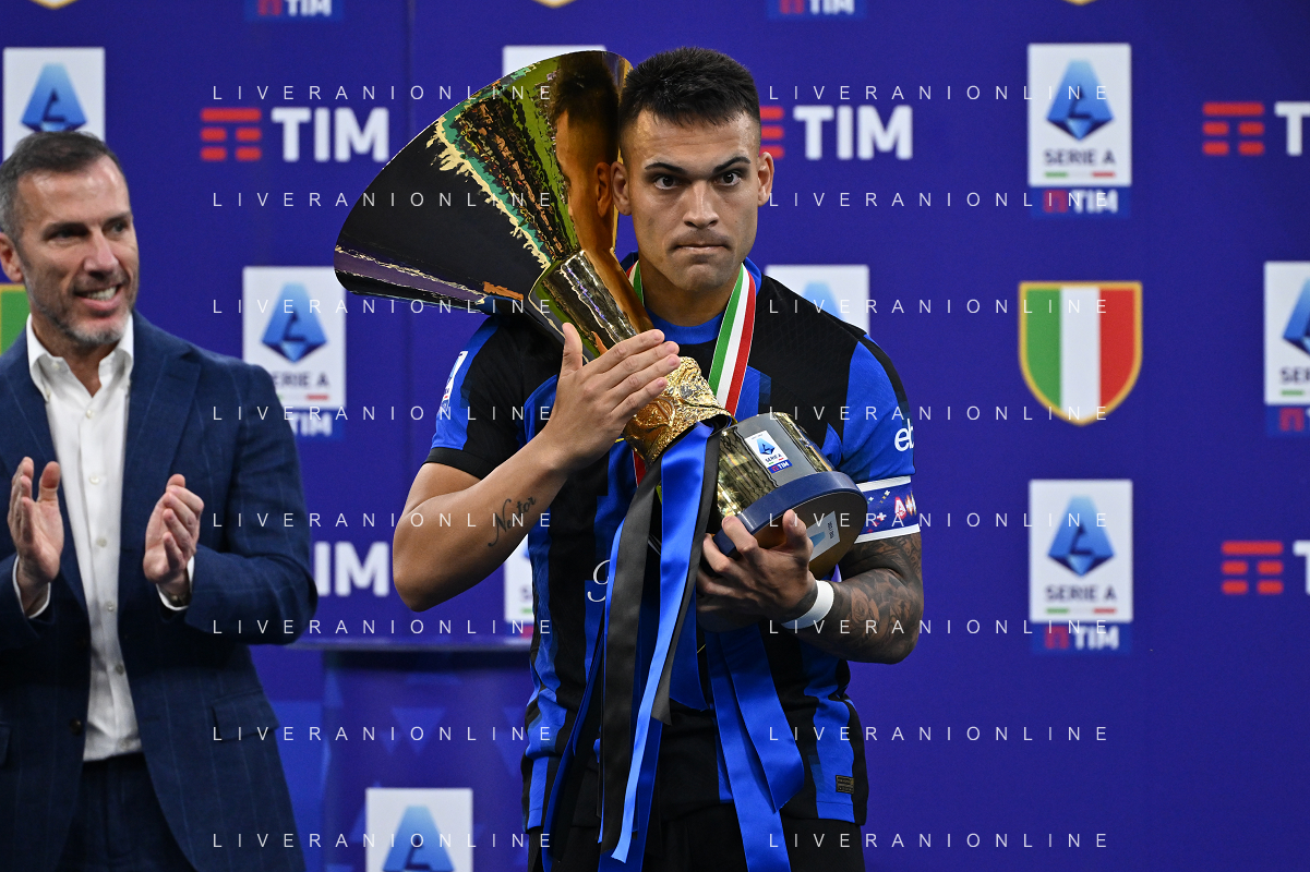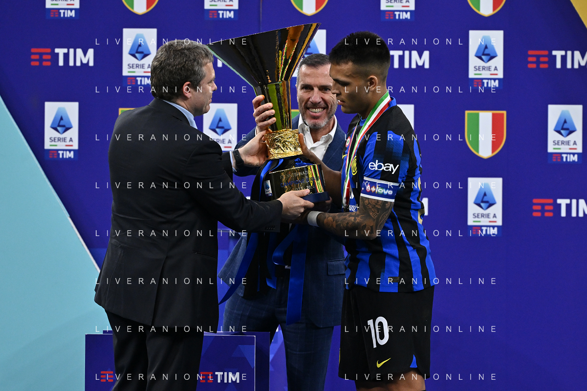 Inter vs Lazio nella foto Lautaro Martinez (Inter) riceve la coppa da Lorenzo Casini presidente Lega Serie A Milano 19-05-2024 Stadio Giuseppe Meazza - San Siro Campionato Serie A TIM - 37a giornata foto Roberto Garavaglia/Agenzia Aldo Liverani sas