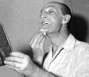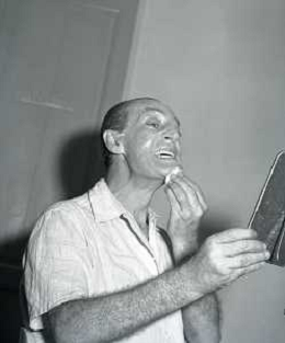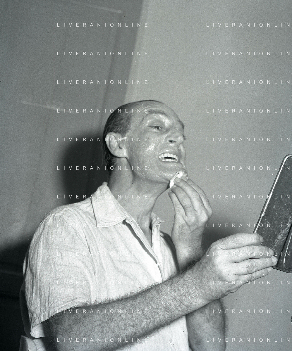 NEG-RETROSPETTIVA ANTONIO DE CURTIS IN ARTE TOTO' NELLA FOTO ANTONIO DE CURTIS IN ARTE TOTO' MENTRE SI FA' LA BARBA A ROMA ANNO 1950 FOTO SANDRO VESPASIANI-AG ALDO LIVERANI SAS