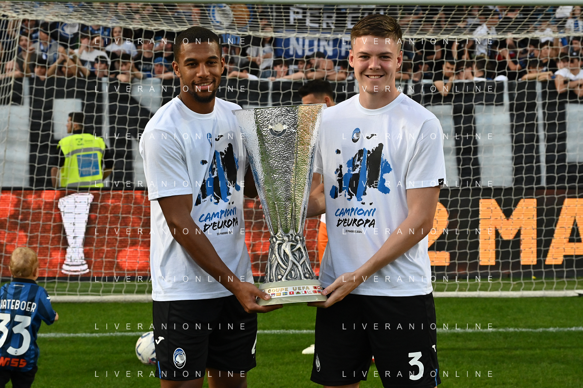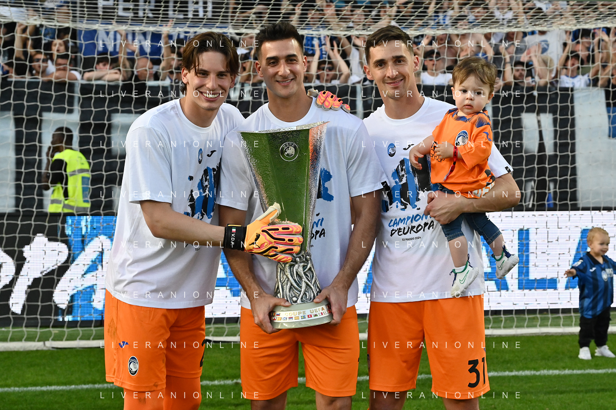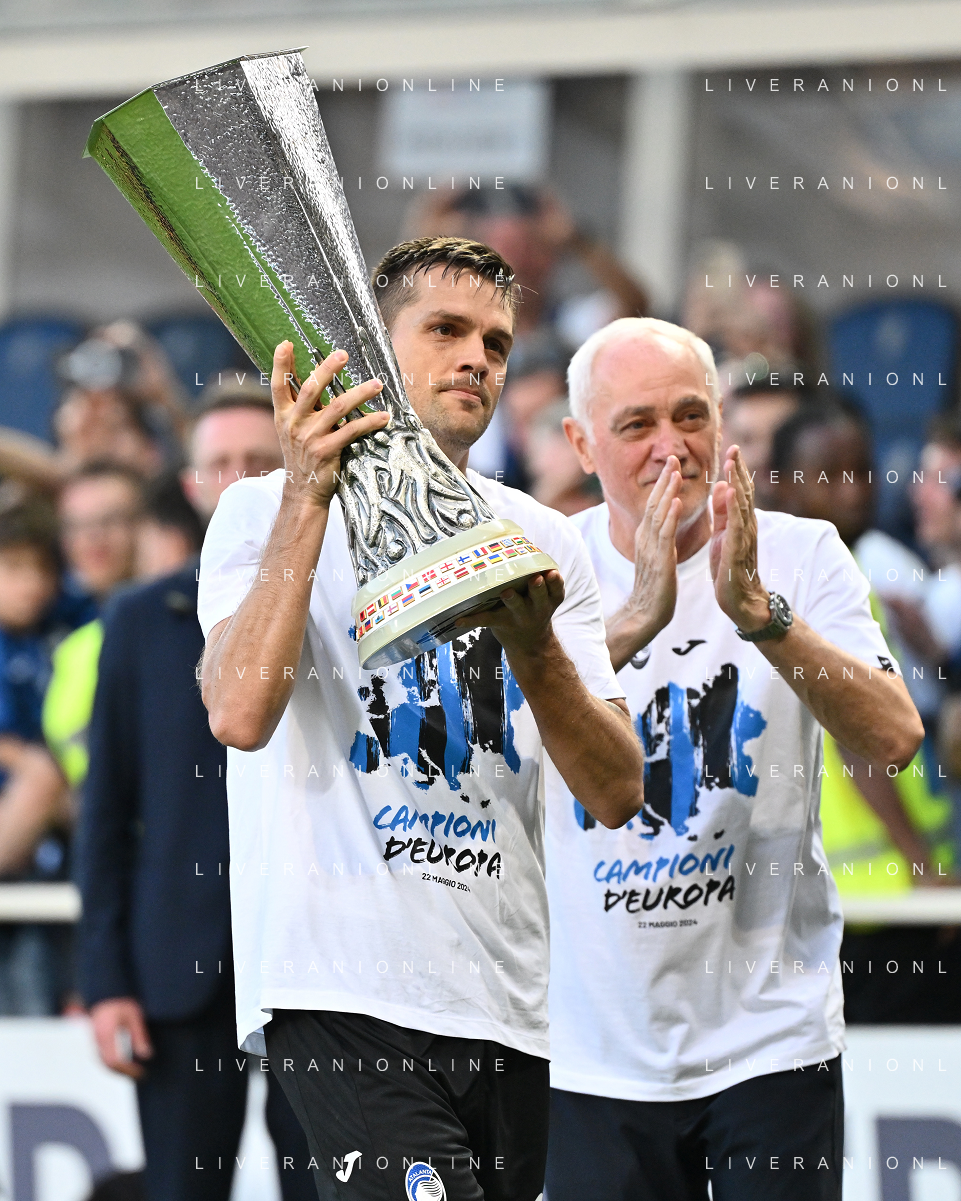 TVRG Atalanta vs Torino nella foto da SX Berat Djimsiti (Atalanta), Mario Pasalic (Atalanta) e Marten de Roon (Atalanta) a fine gara con la coppa trofeo europa league Bergamo 26-05-2024 Gewiss Stadium Campionato Serie A TIM - 38a giornata foto Roberto Garavaglia/Agenzia Aldo Liverani sas/ AGENZIA ALDO LIVERANI SAS