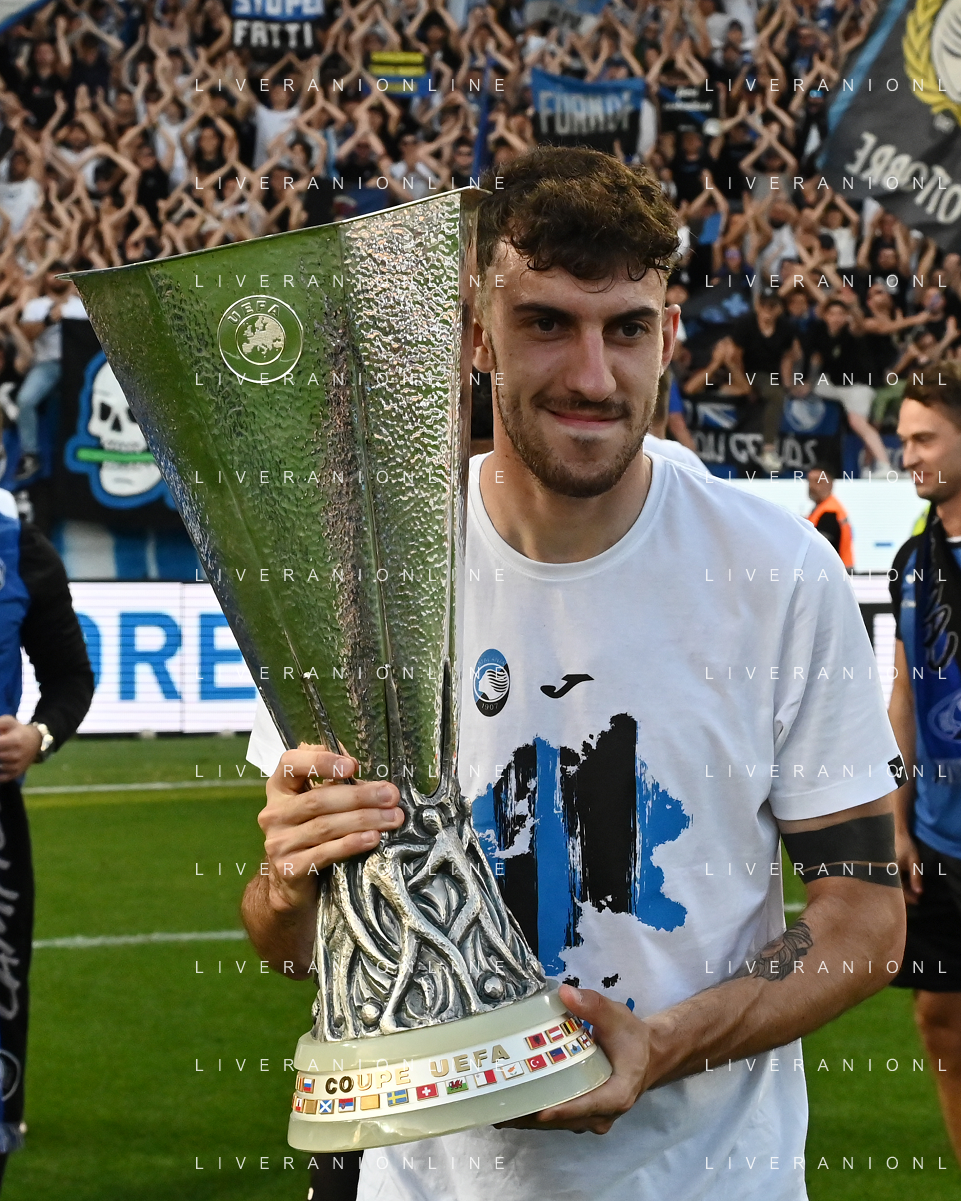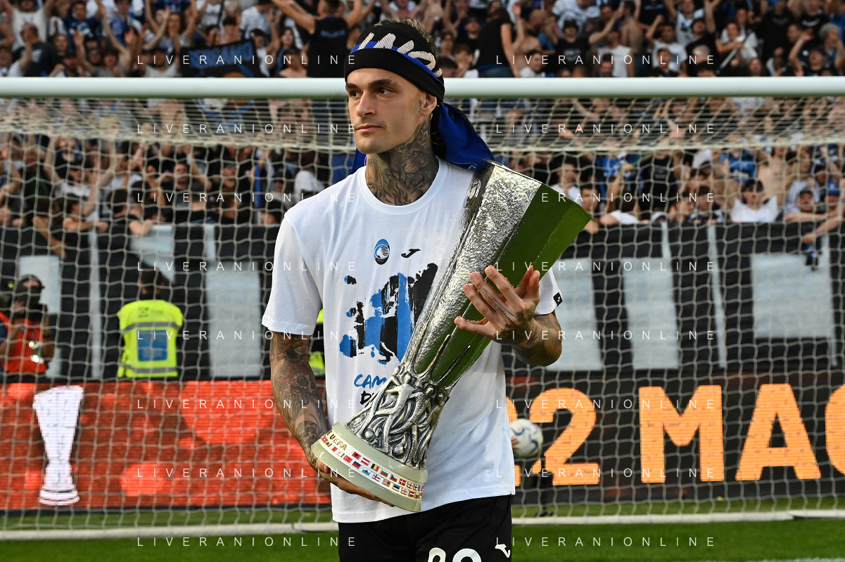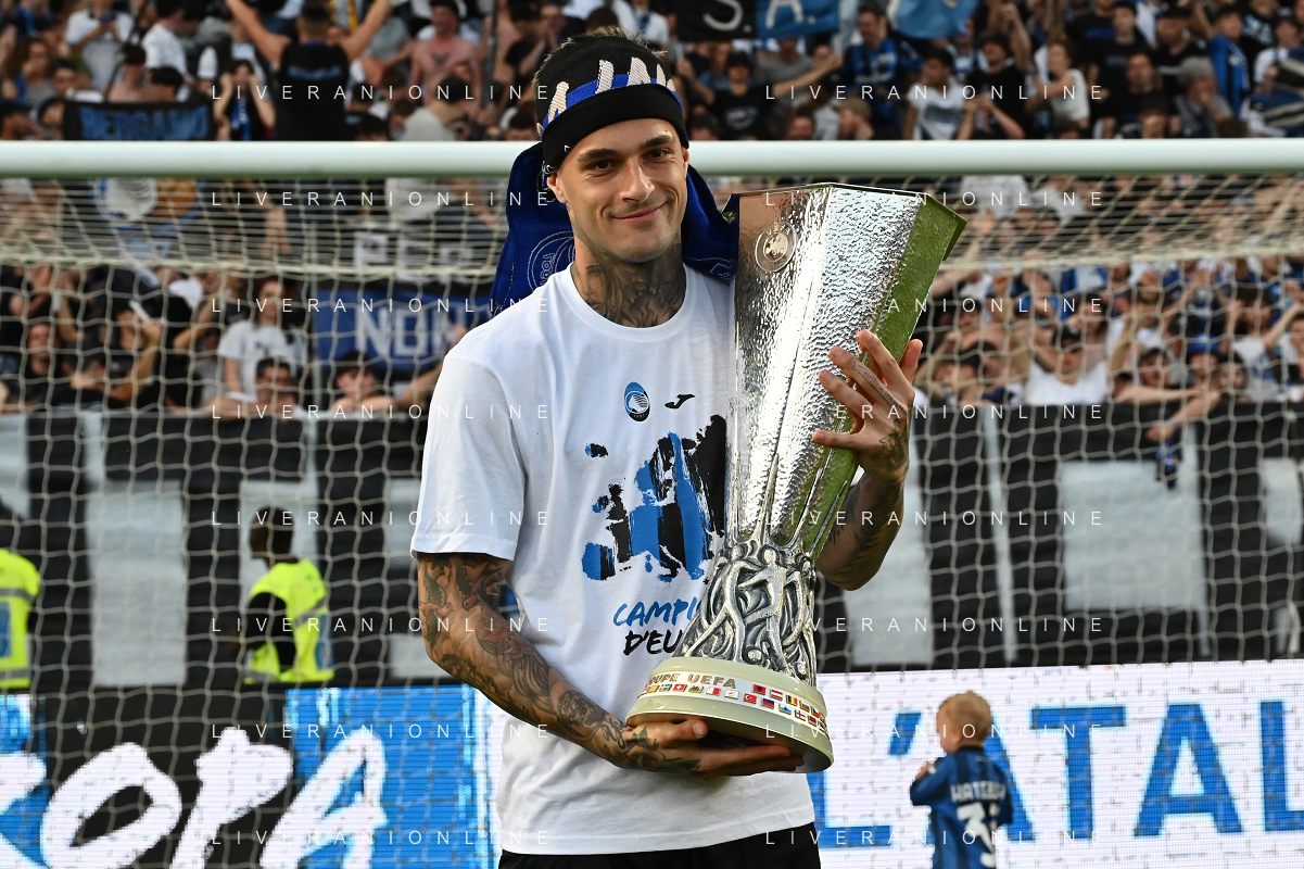 TVRG Atalanta vs Torino nella foto Gianluca Scamacca (Atalanta) a fine gara con la coppa trofeo europa league Bergamo 26-05-2024 Gewiss Stadium Campionato Serie A TIM - 38a giornata foto Roberto Garavaglia/Agenzia Aldo Liverani sas/ AGENZIA ALDO LIVERANI SAS