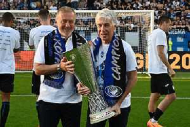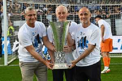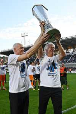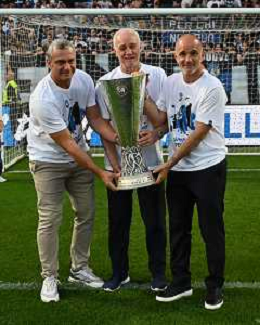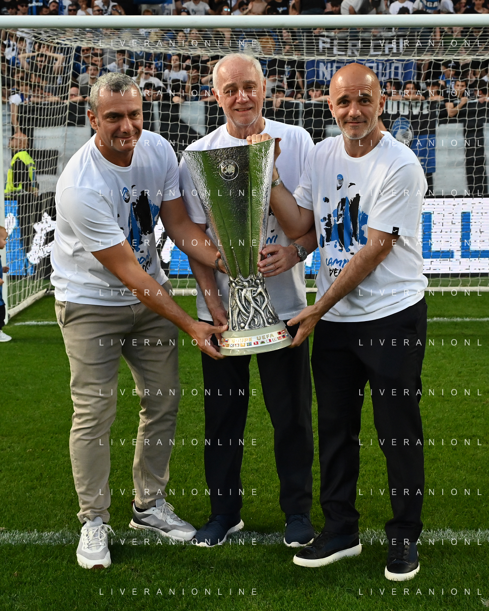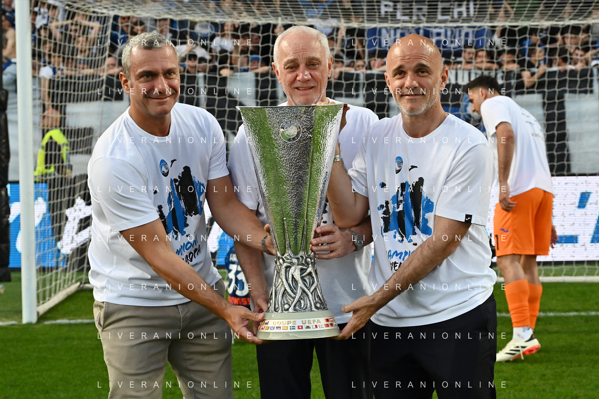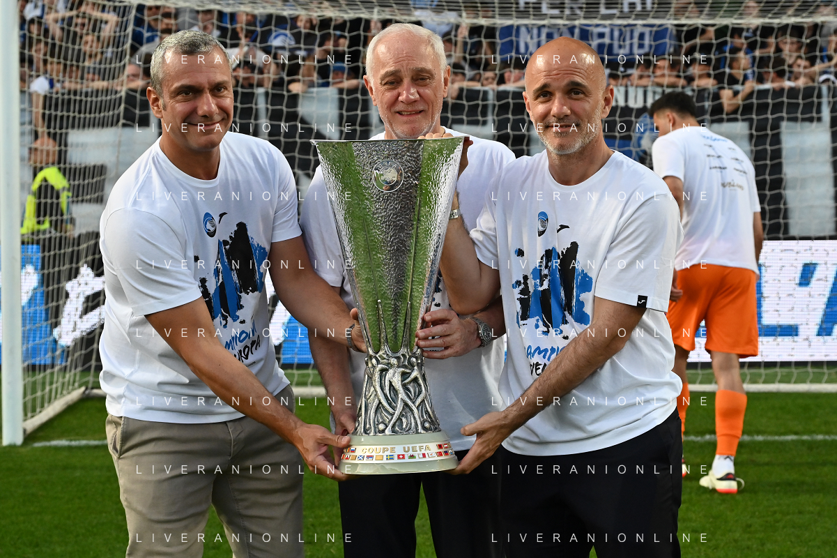 TVRG Atalanta vs Torino nella foto Antonio Percassi presidente Atalanta con i figli Stefano SX e Luca DX amministratore delegato Atalanta a fine gara con la coppa trofeo europa league Bergamo 26-05-2024 Gewiss Stadium Campionato Serie A TIM - 38a giornata foto Roberto Garavaglia/Agenzia Aldo Liverani sas/ AGENZIA ALDO LIVERANI SAS