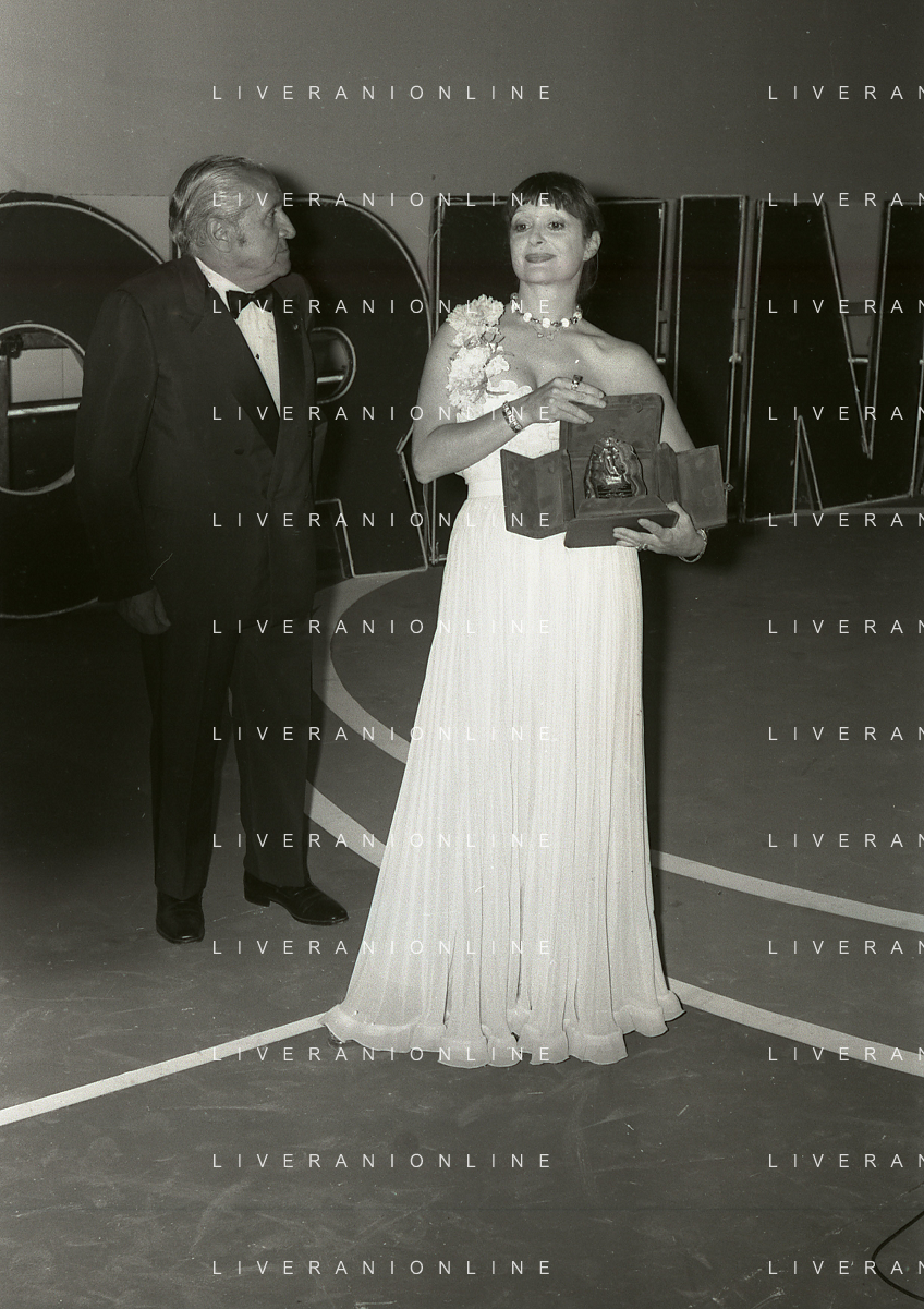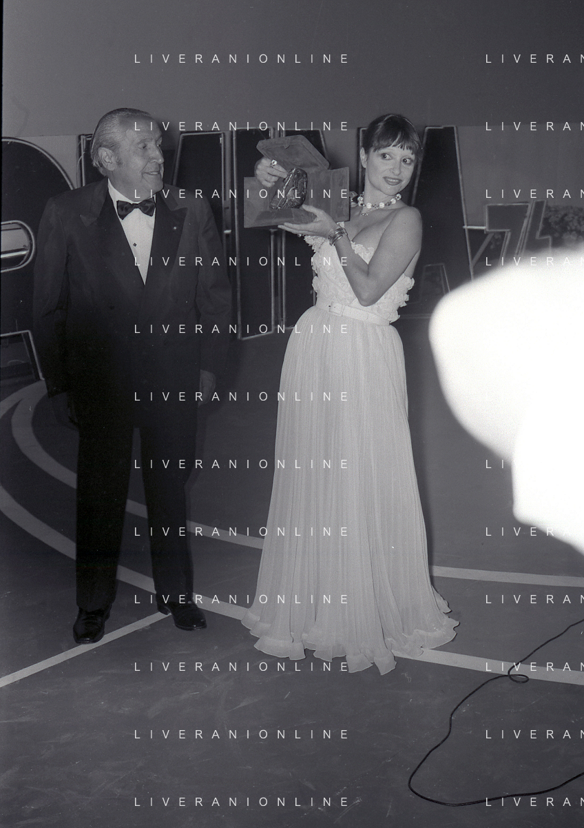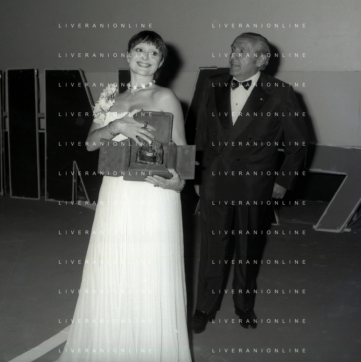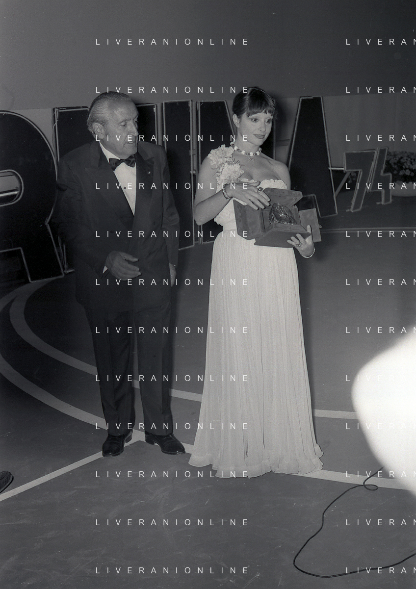NEG-RETROSPETTIVA ADRIANA ASTI ATTRICE NELLA FOTO ADRIANA ASTI CON MIKE BONGIORNO AL 19 PREMIO DEL DAVID DI DONATELLO A TAORMINA ANNO 1974 AG ALDO LIVERANI SAS
