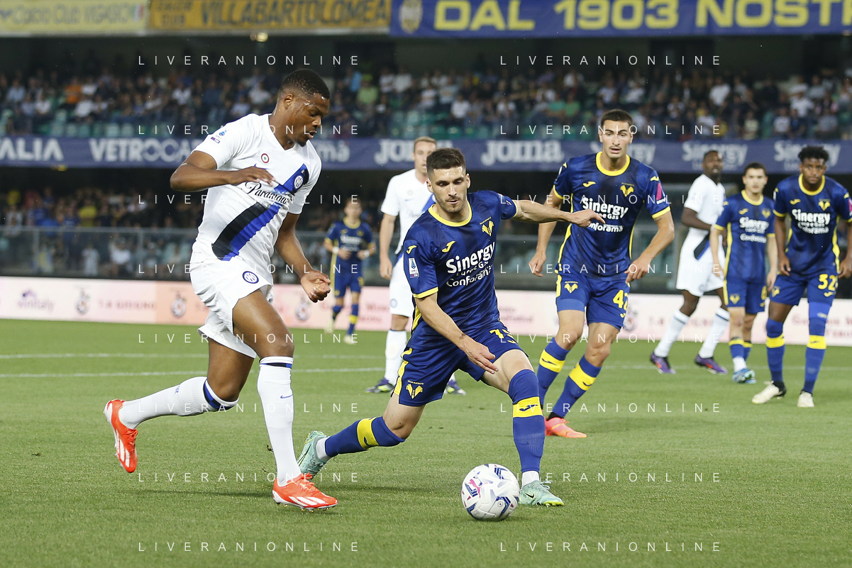 Denzel Dumfries of Inter FC contrtasto2 Ruben Da Silva Nascimiento Vinagre of Hellas Verona FC during Hellas Verona FC vs Internazionale FC, 38° Serie A Tim 2023-24 game at Marcantonio Bentegodi Stadium in Verona (VR), Italy, on May 26, 2024. (Photo by Davide Casentini) / AGENZIA ALDO LIVERANI SAS