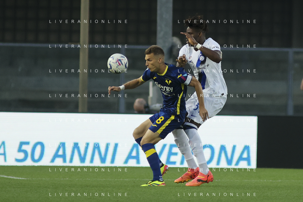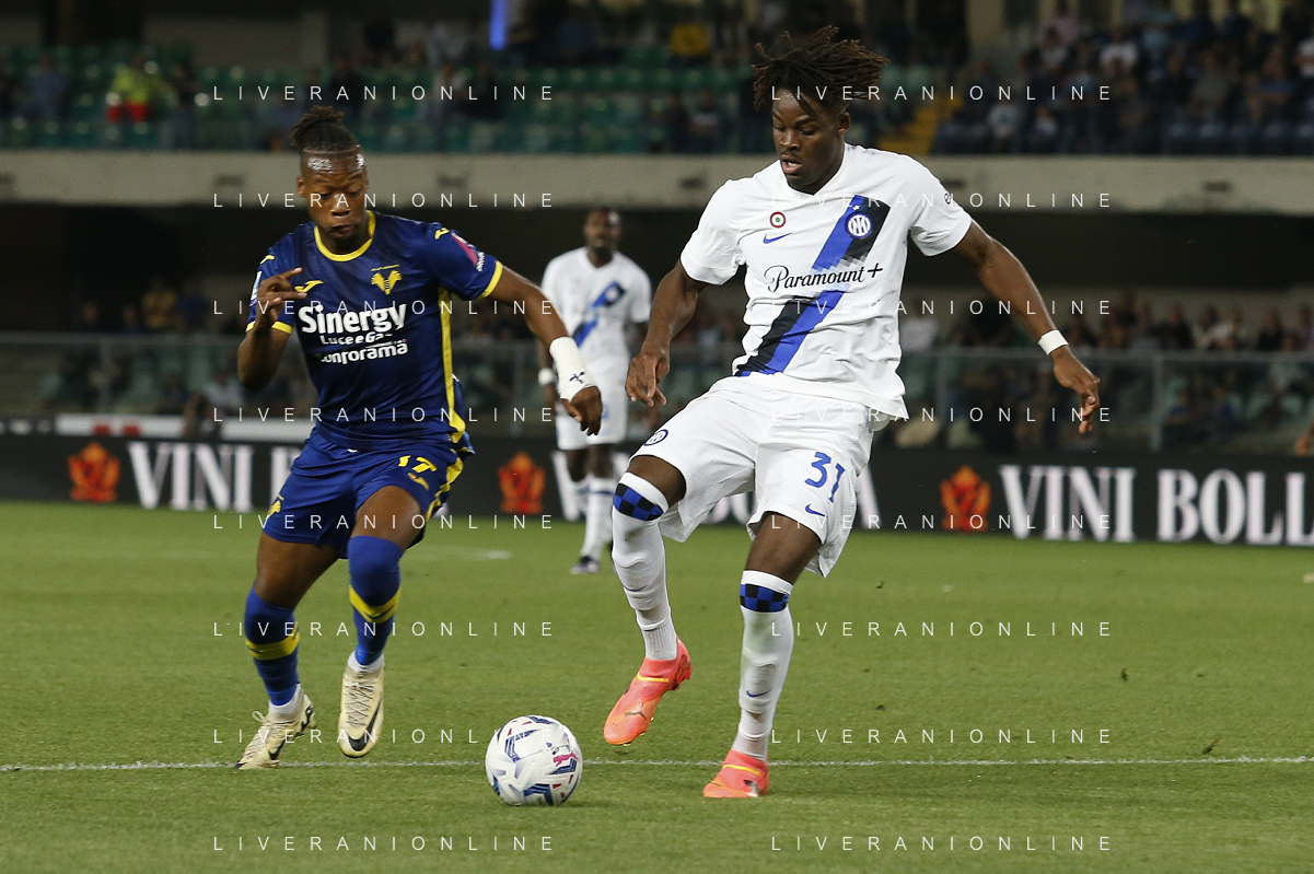 Tijjani Noslin of Hellas Verona FC battle for the ball with Yann Bisseck of Inter FC during Hellas Verona FC vs Internazionale FC, 38° Serie A Tim 2023-24 game at Marcantonio Bentegodi Stadium in Verona (VR), Italy, on May 26, 2024. (Photo by Davide Casentini) / AGENZIA ALDO LIVERANI SAS