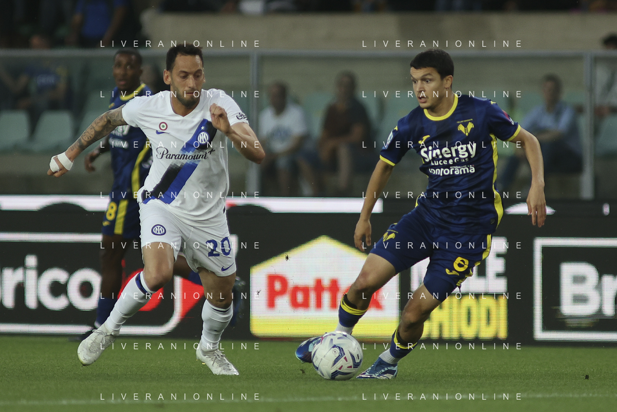 Reda Belahyane of Hellas Verona FC competes for the ball with Hakan Calhanoglu of Inter FC during Hellas Verona FC vs Internazionale FC, 38° Serie A Tim 2023-24 game at Marcantonio Bentegodi Stadium in Verona (VR), Italy, on May 26, 2024. (Photo by Davide Casentini) / AGENZIA ALDO LIVERANI SAS