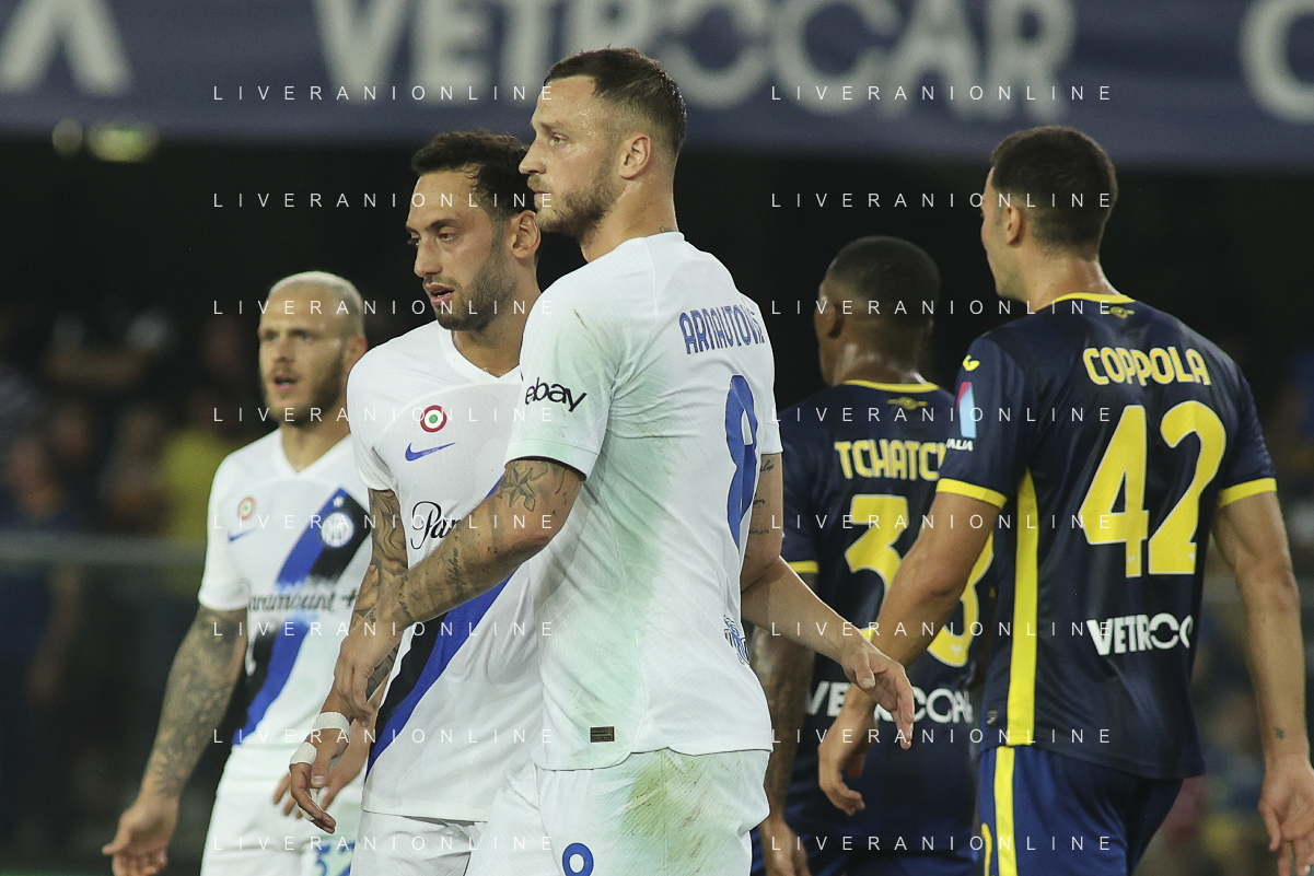 Marko Arnautovic of Inter FC dribling on Juan David Cabal Murillo of Hellas Verona FC during Hellas Verona FC vs Internazionale FC, 38° Serie A Tim 2023-24 game at Marcantonio Bentegodi Stadium in Verona (VR), Italy, on May 26, 2024. (Photo by Davide Casentini) / AGENZIA ALDO LIVERANI SAS