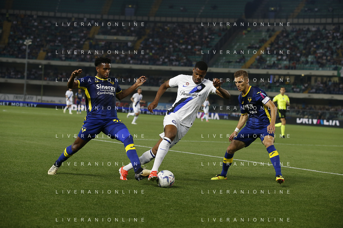 Denzel Dumfries of Inter FCcompetes for the ball with Juan David Cabal Murillo of Hellas Verona FC and Darko Lazovic of Hellas Verona FC during Hellas Verona FC vs Internazionale FC, 38° Serie A Tim 2023-24 game at Marcantonio Bentegodi Stadium in Verona (VR), Italy, on May 26, 2024. (Photo by Davide Casentini) / AGENZIA ALDO LIVERANI SAS