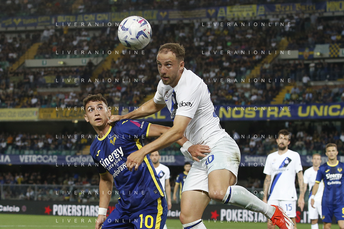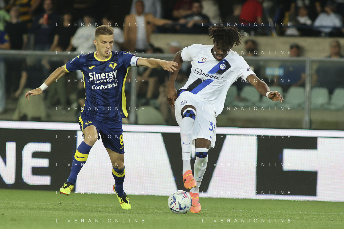 Darko Lazovic of Hellas Verona FC battle for the ball with Yann Bisseck of Inter FC during Hellas Verona FC vs Internazionale FC, 38° Serie A Tim 2023-24 game at Marcantonio Bentegodi Stadium in Verona (VR), Italy, on May 26, 2024. (Photo by Davide Casentini) / AGENZIA ALDO LIVERANI SAS