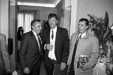Neg- SERATA DEDICATA AL CICLISMO TRASMESSA SU ITALIA1 NELL'ANNO 1993 - RETROSPETTIVA Nella foto IL DIRETTORE DELLA GAZZETTA DELLO SPORT CANDIDO CANNAVO' CON IL CICLISTA FRANCESCO MOSER E IL GIORNALISTA ANGELO ZOMEGNAN AG ALDO LIVERANI SAS