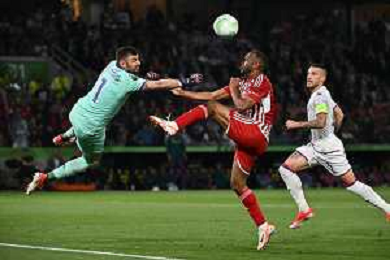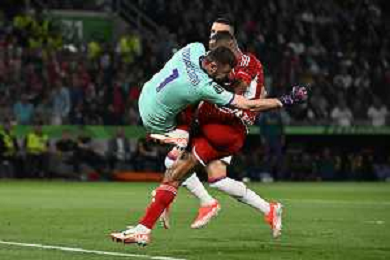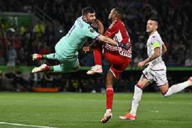 TVRG Olympiacos vs Fiorentina nella foto Pietro Terracciano (Fiorentina) anticiopa in uscita Ayoub El Kaabi (Olympiakos) e poi si scontrano violentemente Atene (GRE) 29-05-2024 AEK Arena Finale UEFA Conference League foto Roberto Garavaglia/Agenzia Aldo Liverani sas / AGENZIA ALDO LIVERANI SAS