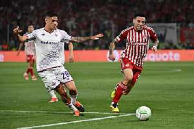 TVRG Olympiacos vs Fiorentina nella foto Daniel Podence (Olympiakos) e sulla DX Nicolas Gonzalez (Fiorentina) Atene (GRE) 29-05-2024 AEK Arena Finale UEFA Conference League foto Roberto Garavaglia/Agenzia Aldo Liverani sas / AGENZIA ALDO LIVERANI SAS