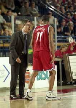NEG-03-01-1999 REGGIO EMILIA CAMPIONATO DI BASKET SERIE A 1 ZUCCHETTI SOFTWARE REGGIO EMILIA-SONY MILANO NELLA FOTO MELVIN BOOKER CON MARCO CRESPI ALLENATORE SONY MILANO AG ALDO LIVERANI SAS