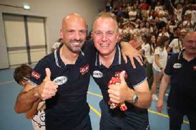 IMOLA 01 06 2024 CLAI IMOLA PALLAVOLO-VILLA CORTESE FINALE PLAY OFF B1 3-0 PROMOZIONE IN A2 NELLA FOTO ALLENATORE NELLO CALIENDO CON PRESIDENTE STEFANO MONGARDI FOTO GIANNI SANNA-AG ALDO LIVERANI SAS