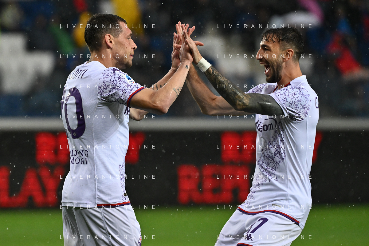 TVRG Atalanta vs Fiorentina nella foto Andrea Belotti (Fiorentina) e Gaetano Castrovilli (Fiorentina) esultano dopo il gol dell'1 a 0 Bergamo 02-06-2024 Gewiss Stadium Campionato Serie A TIM - recupero della 29a giornata foto Roberto Garavaglia/Agenzia Aldo Liverani sas / AGENZIA ALDO LIVERANI SAS