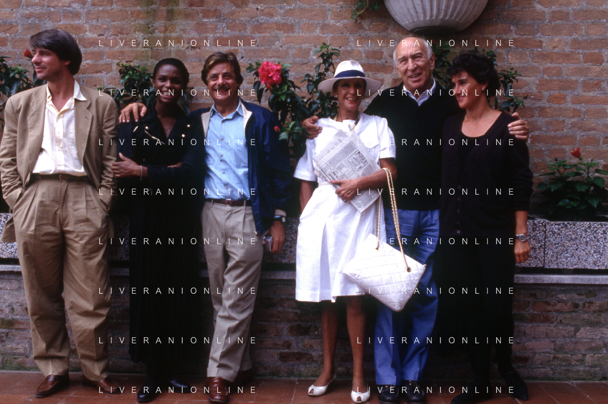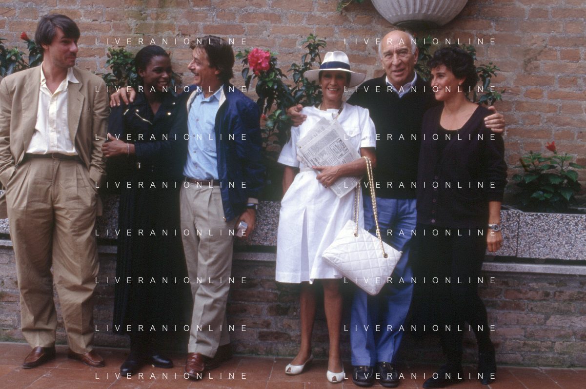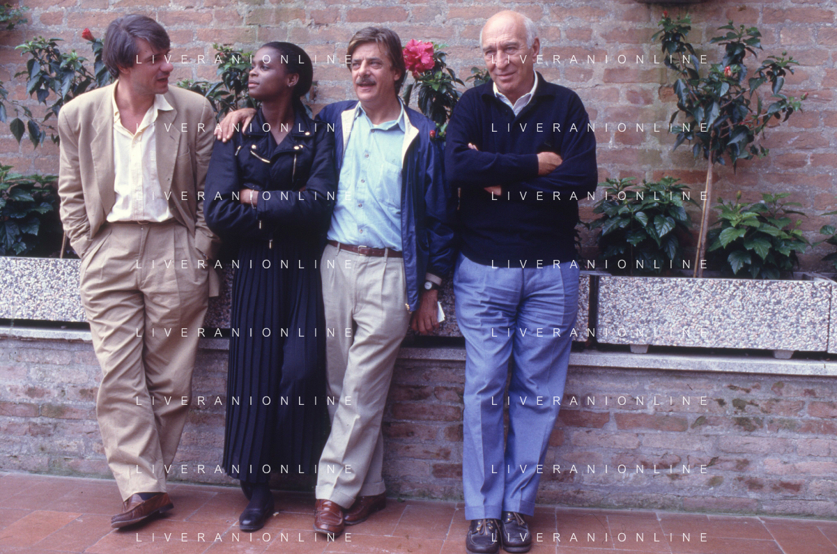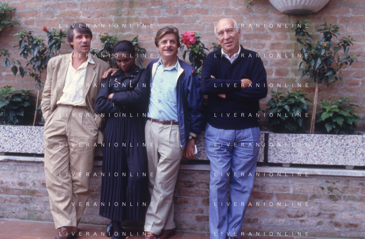 DIAP-RETROSPETTIVA RICKY TOGNAZZI ATTORE NELLA FOTO RICKY TOGNAZZI A VENEZIA NELL'ANNO 1989 CON GIULIANO MONTALDO-GIANCARLO GIANNINI E P.FLORA PRAXO AG ALDO LIVERANI SAS