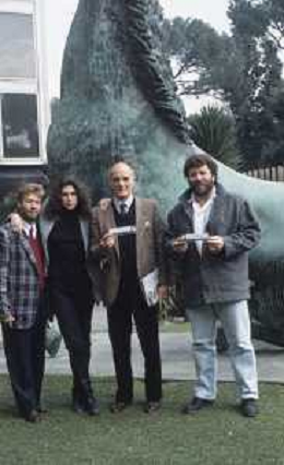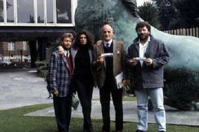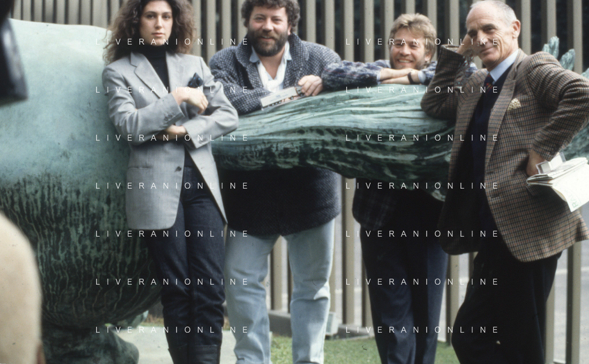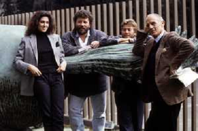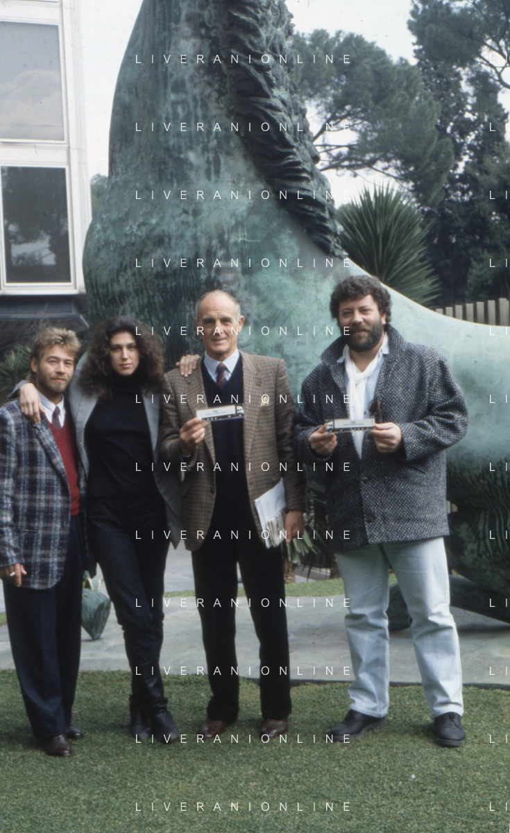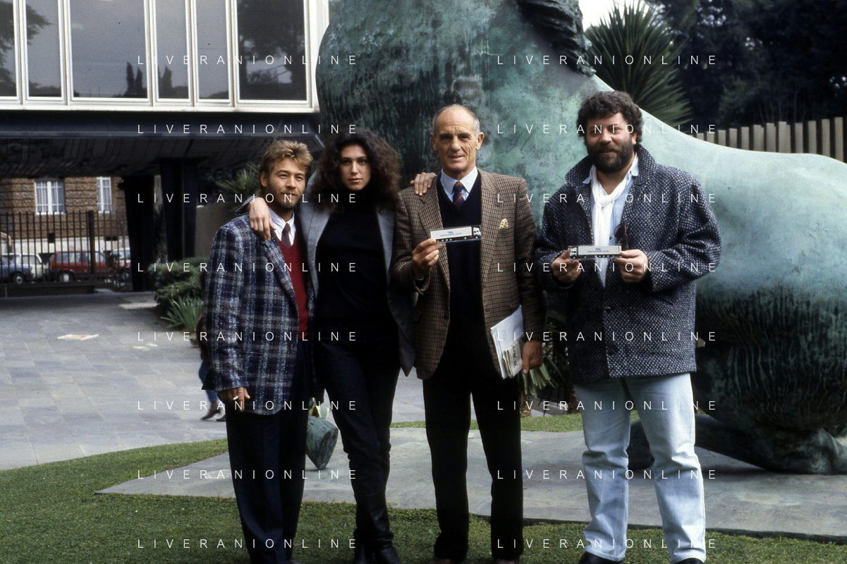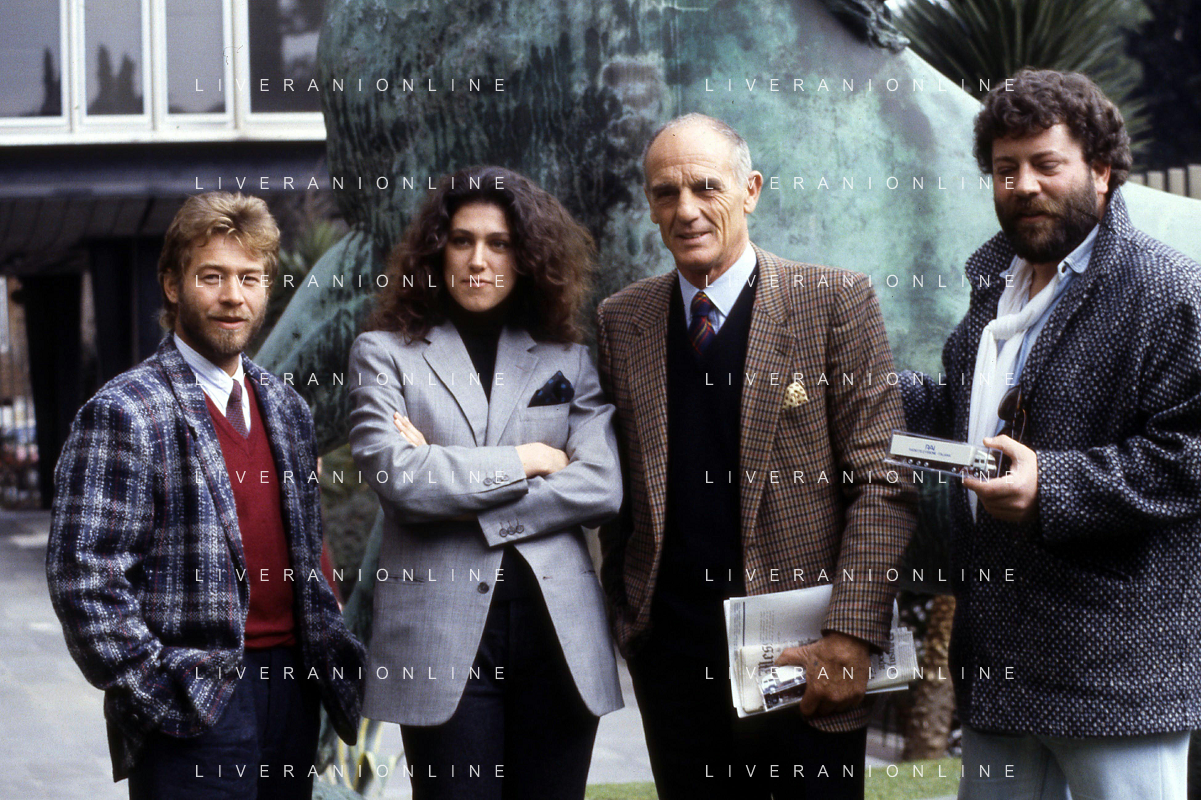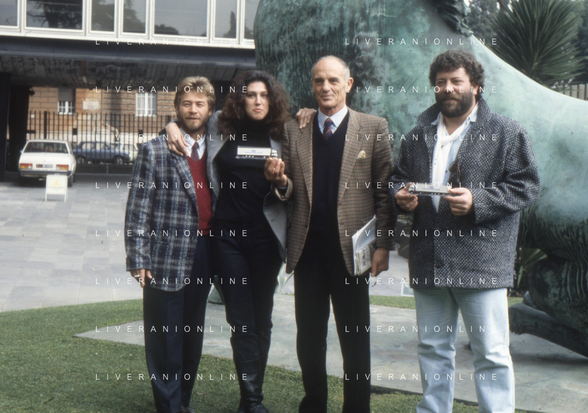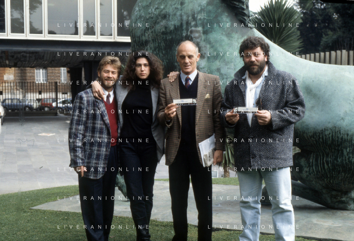 DIAP-RETROSPETTIVA PHILIPPE LEROY ATTORE NELLA FOTO PHILIPPE LEROY CON ALBA MOTTURA-RENATO D'AMORE E CHRISTIAN FREMONT PRESENTAZIONE IN RAI A ROMA DEL FILM“DUE ASSI PER UN TURBO“ ANNO 1987 FOTO EDGARDO DELLA SCORCIOSA-AG ALDO LIVERANI SAS