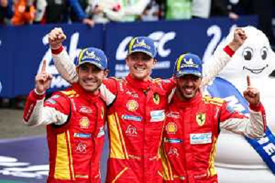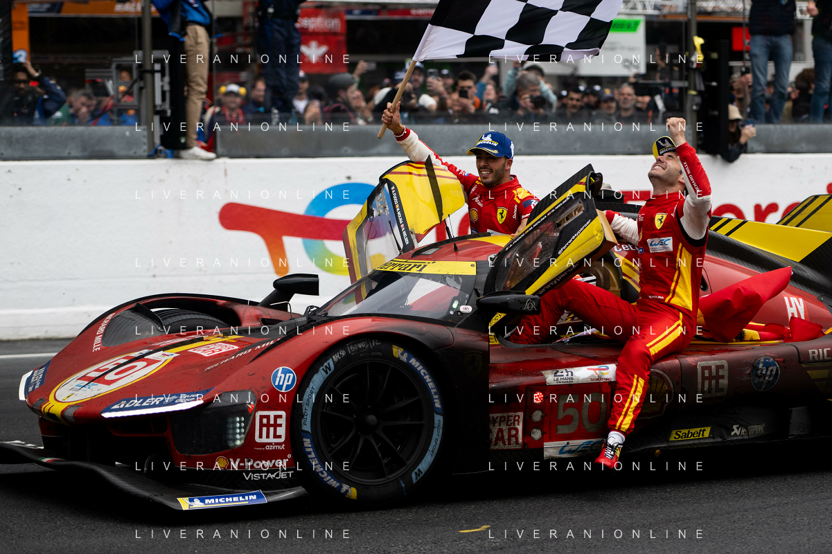 Race winners Antonio Fuoco (ITA) / Miguel Molina (ESP) / Nicklas Nielsen (DEN) #50 Ferrari AF Corse, Ferrari 499P celebrate at the end of the race. 16.06.2024. FIA World Endurance Championship, Round 4, Le Mans 24 Hours, Race, Le Mans, France, Sunday. - www.xpbimages.com, EMail: requests@xpbimages.com - Copyright: Price / XPB Images AG ALDO LIVERANI SAS-ONLY ITALY
