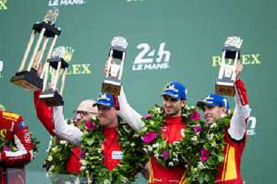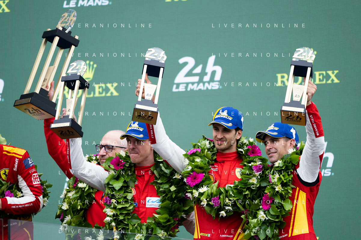 James Calado (GBR) / Alessandro Pier Guidi (ITA) / Antonio Giovinazzi (ITA) #51 AF Corse, celebrate third position on the podium. 16.06.2024. FIA World Endurance Championship, Round 4, Le Mans 24 Hours, Race, Le Mans, France, Sunday. - www.xpbimages.com, EMail: requests@xpbimages.com - Copyright: Price / XPB Images AG ALDO LIVERANI SAS-ONLY ITALY
