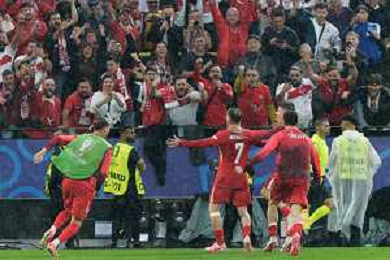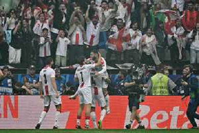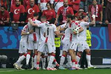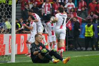TVEM Georges Mikautadze of Georgia celebrates after scoring a goal with teammates during the UEFA EURO 2024 group stage match between Turkey and Georgia at Westfalenstadion on June 18, 2024 in Dortmund, Germany. Photo by Emmanuele Mastrodonato/ag. Aldo Liverani sas/AGENZIA ALDO LIVERANI SAS