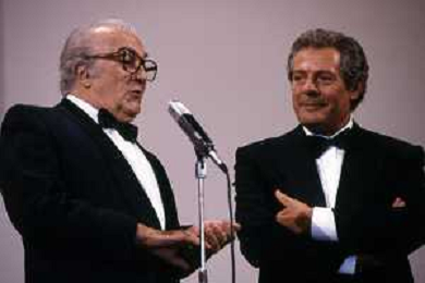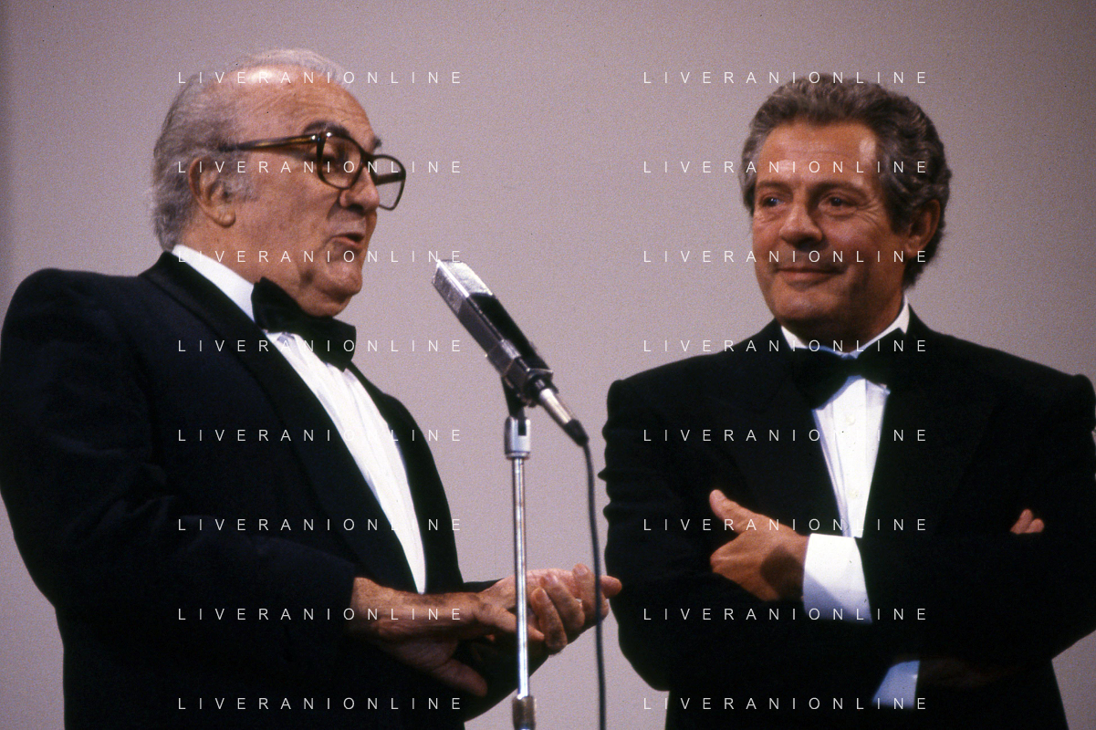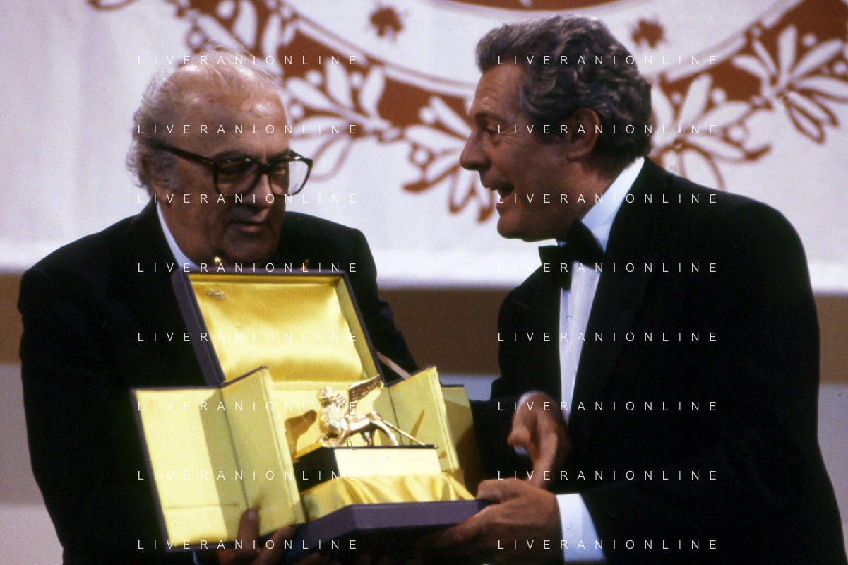 DIAP-RETROSPETTIVA MARCELLO MASTROIANNI ATTORE NELLA FOTO MARCELLO MASTROIANNI ALLA PREMIAZIONE DEL LEONE D'ORO ALLA CARRIERA A VENEZIA NELL'ANNO 1990 MOSTRA INTERNAZIONALE DEL CINEMA E FEDERICO FELLINI AG ALDO LIVERANI SAS