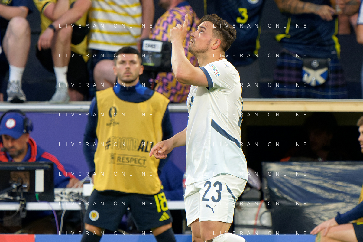TVEM Xherdan Shaqiri of Swiss celebrates after scoring a goal with teammates during the UEFA EURO 2024 group stage match between Scotland and Switzerland at Cologne Stadium on June 19, 2024 in Cologne, Germany. Photo by Emmanuele Mastrodonato/ag. Aldo Liverani sas/AGENZIA AGENZIA ALDO LIVERANI SAS
