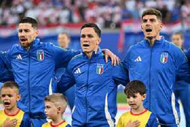 Croazia vs Italia - UEFA EURO 2024 nella foto da SX Federico Dimarco (Italia), Jorginho Jorge Luiz Filho (Italia) e Giacomo Raspadori (Italia) durante l'Inno Nazionale Lipsia (GER) 24-06-2024 Leipzig Stadium - Red Bull Arena Campionato Europeo di Calcio - UEFA EURO 2024 fase a gironi - 3a giornata Gruppo B foto Roberto Garavaglia/Agenzia Aldo Liverani sas