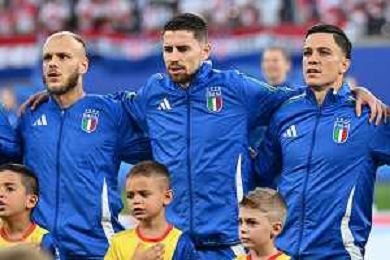 Croazia vs Italia - UEFA EURO 2024 nella foto da SX Jorginho Jorge Luiz Filho (Italia), Giacomo Raspadori (Italia) e Giovanni Di Lorenzo (Italia) durante l'Inno Nazionale Lipsia (GER) 24-06-2024 Leipzig Stadium - Red Bull Arena Campionato Europeo di Calcio - UEFA EURO 2024 fase a gironi - 3a giornata Gruppo B foto Roberto Garavaglia/Agenzia Aldo Liverani sas