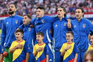 Croazia vs Italia - UEFA EURO 2024 nella foto da SX Gianluigi Donnarumma (Italia), Nicolò Barella (Italia), Alessandro Bastoni (Italia), Riccardo Calafiori (Italia) e Matteo Darmian (Italia) durante l'Inno Nazionale Lipsia (GER) 24-06-2024 Leipzig Stadium - Red Bull Arena Campionato Europeo di Calcio - UEFA EURO 2024 fase a gironi - 3a giornata Gruppo B foto Roberto Garavaglia/Agenzia Aldo Liverani sas
