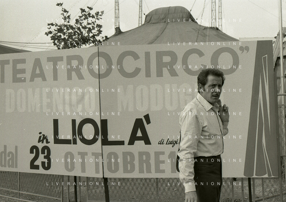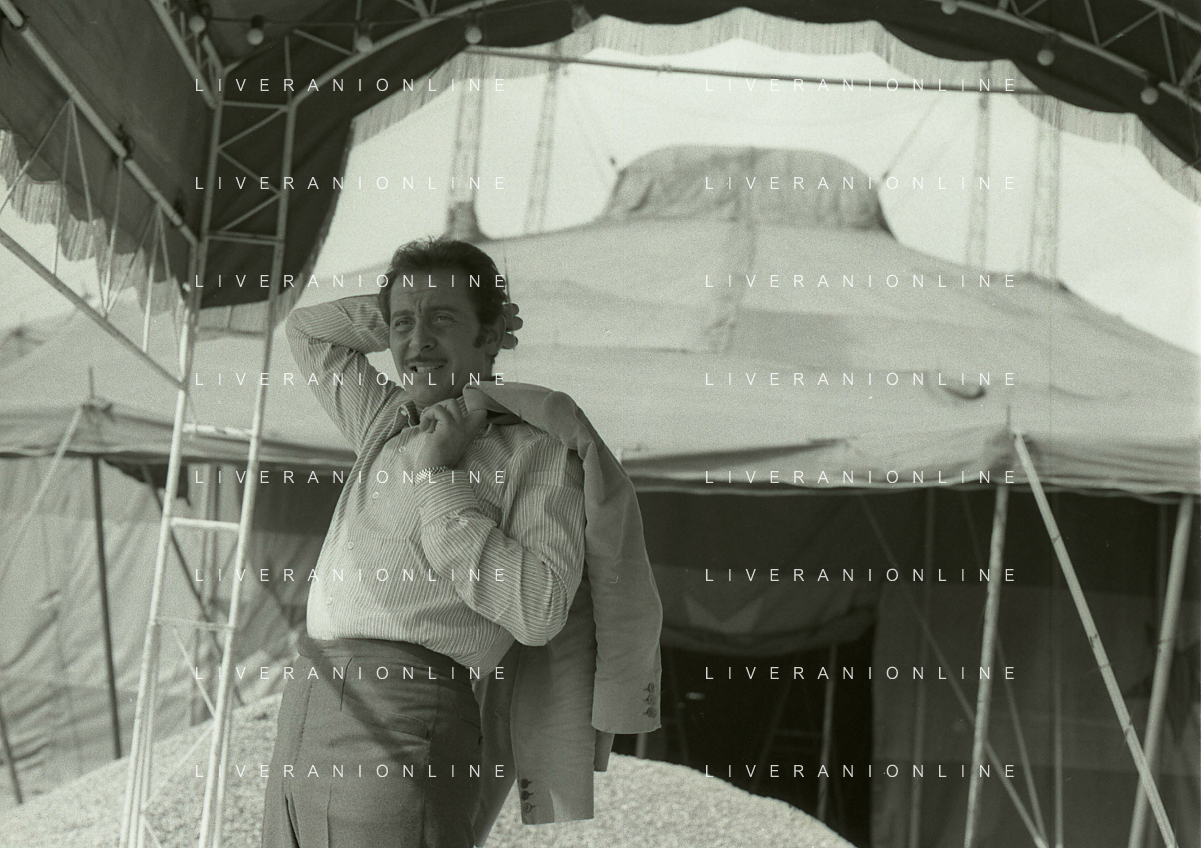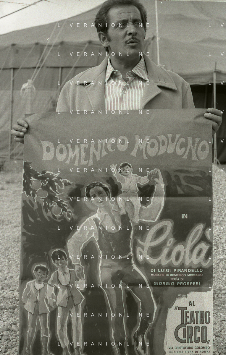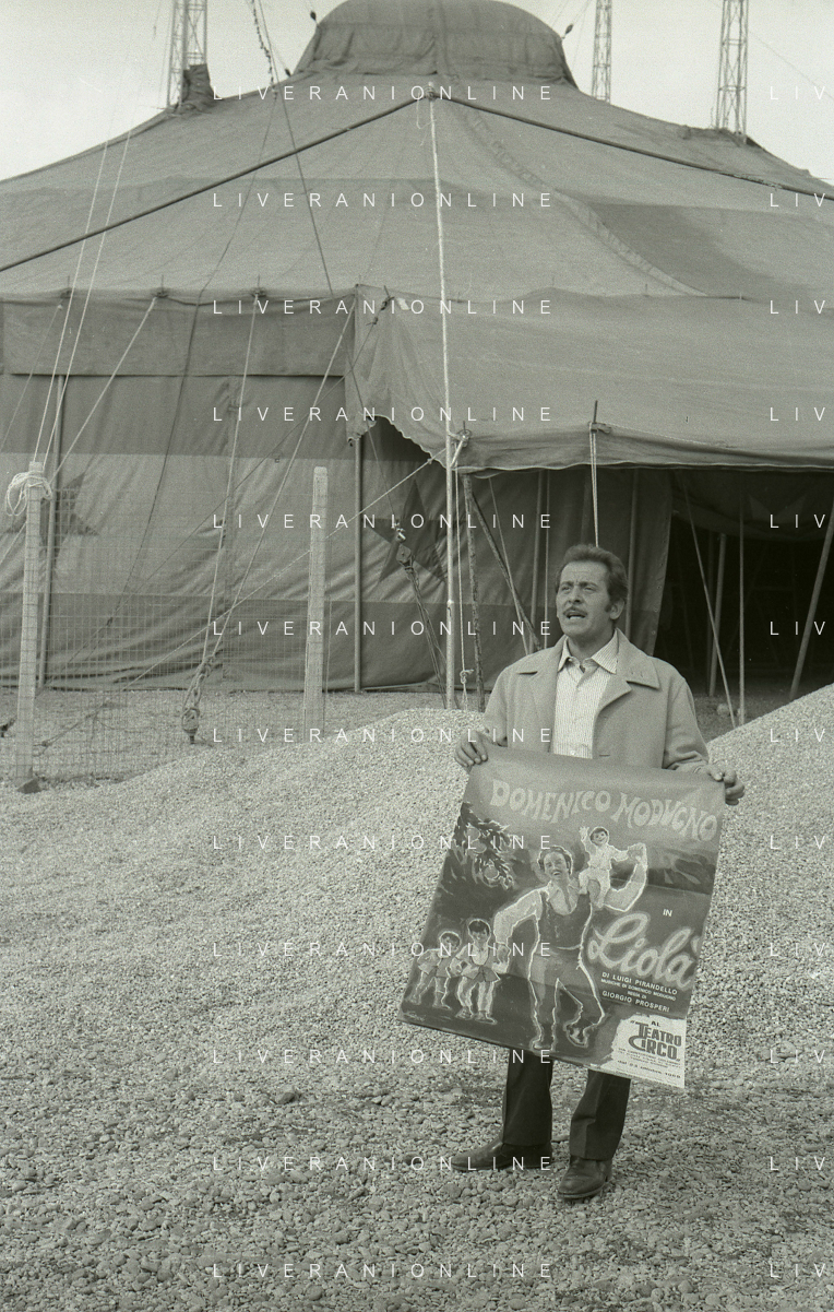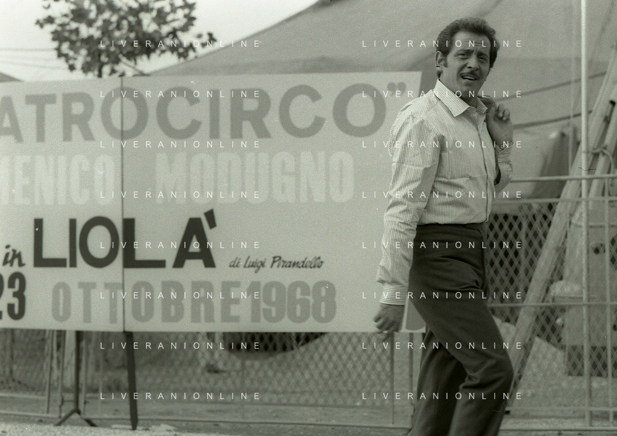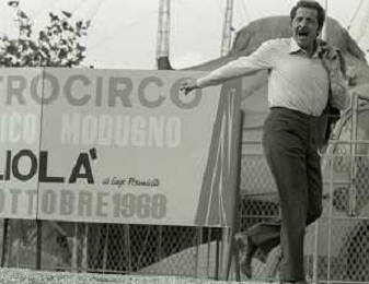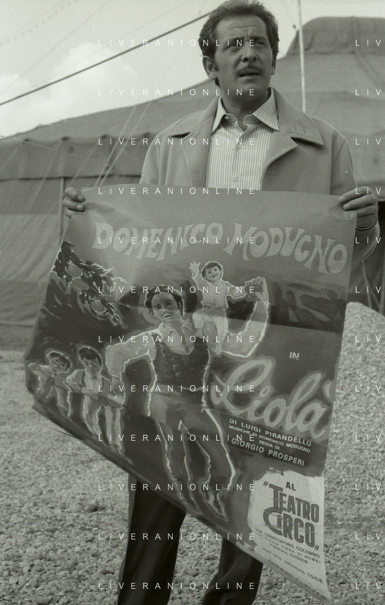 NEG-RETROSPETTIVA DOMENICO MODUGNO CANTANTE NELLA FOTO DOMENICO MODUGNO NEL 1968 E IL SUO CIRCO TEATRO AG ALDO LIVERANI SAS