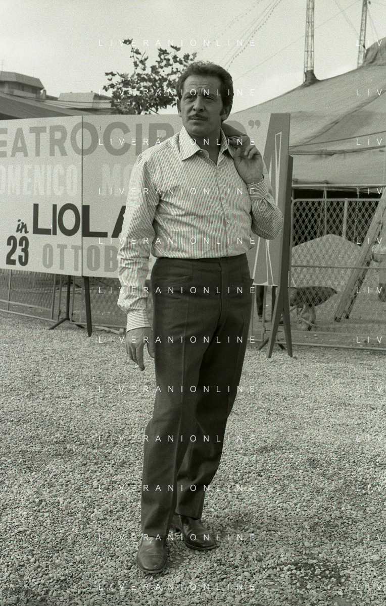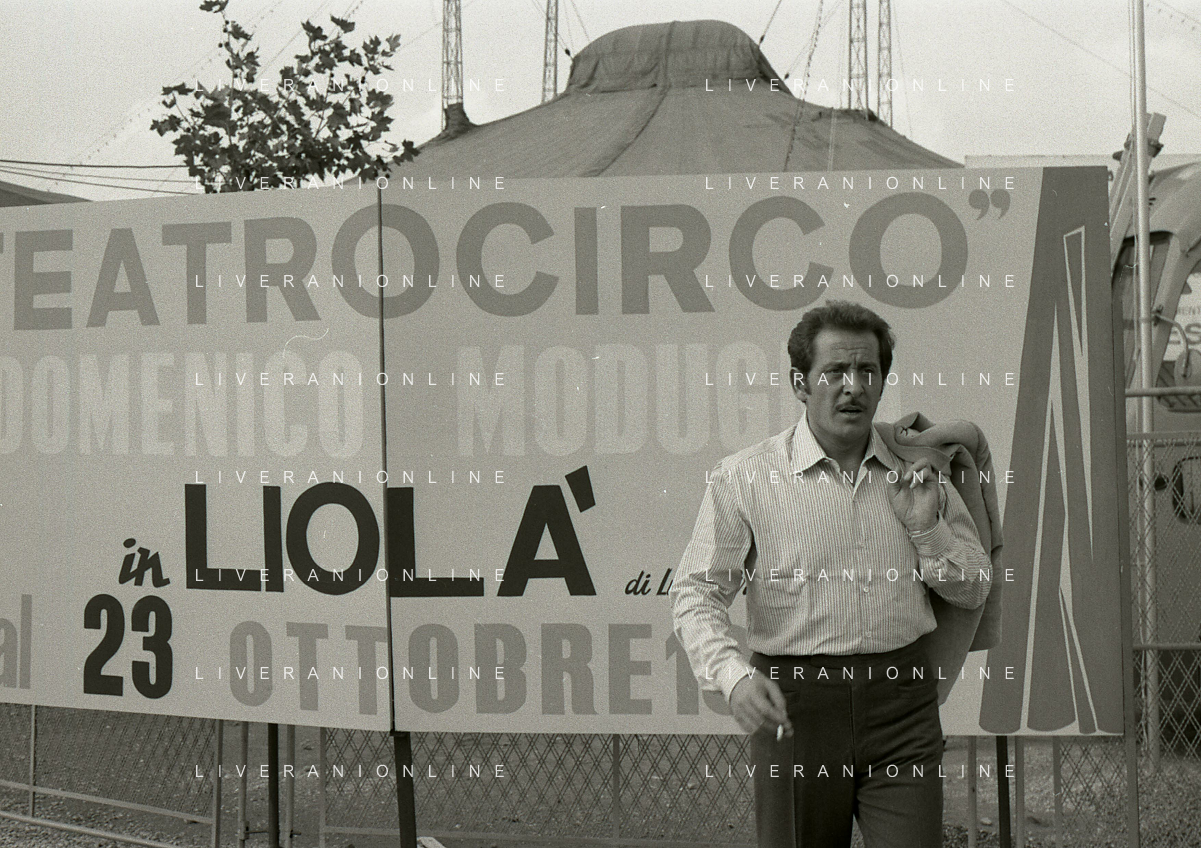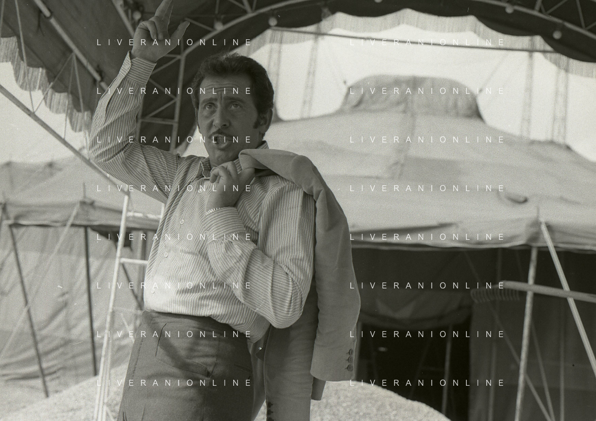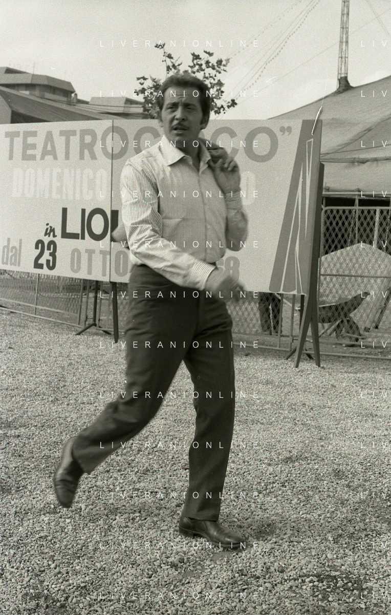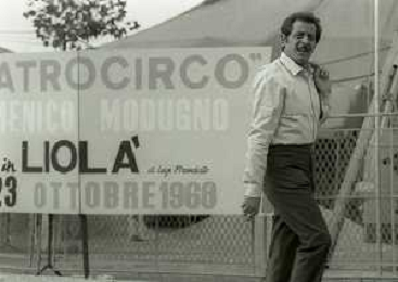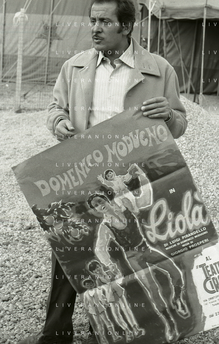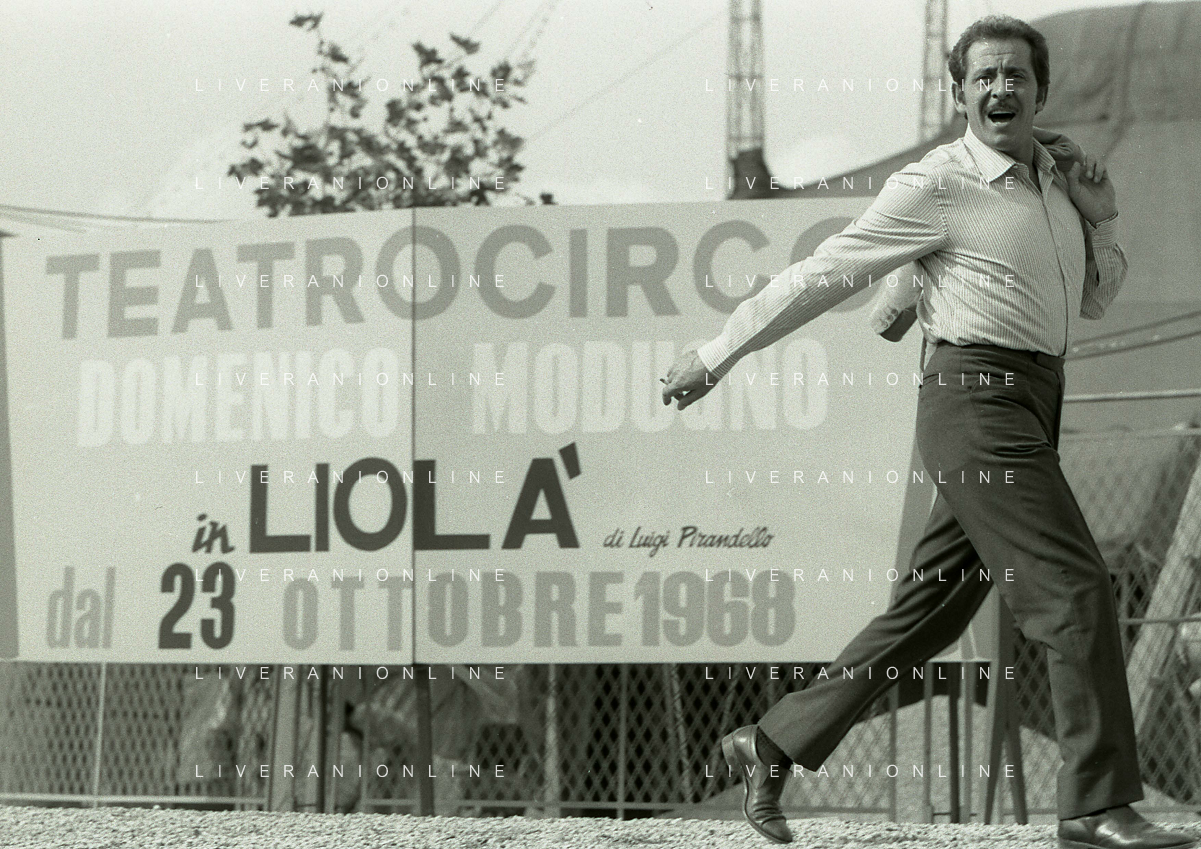 NEG-RETROSPETTIVA DOMENICO MODUGNO CANTANTE NELLA FOTO DOMENICO MODUGNO NEL 1968 E IL SUO CIRCO TEATRO AG ALDO LIVERANI SAS