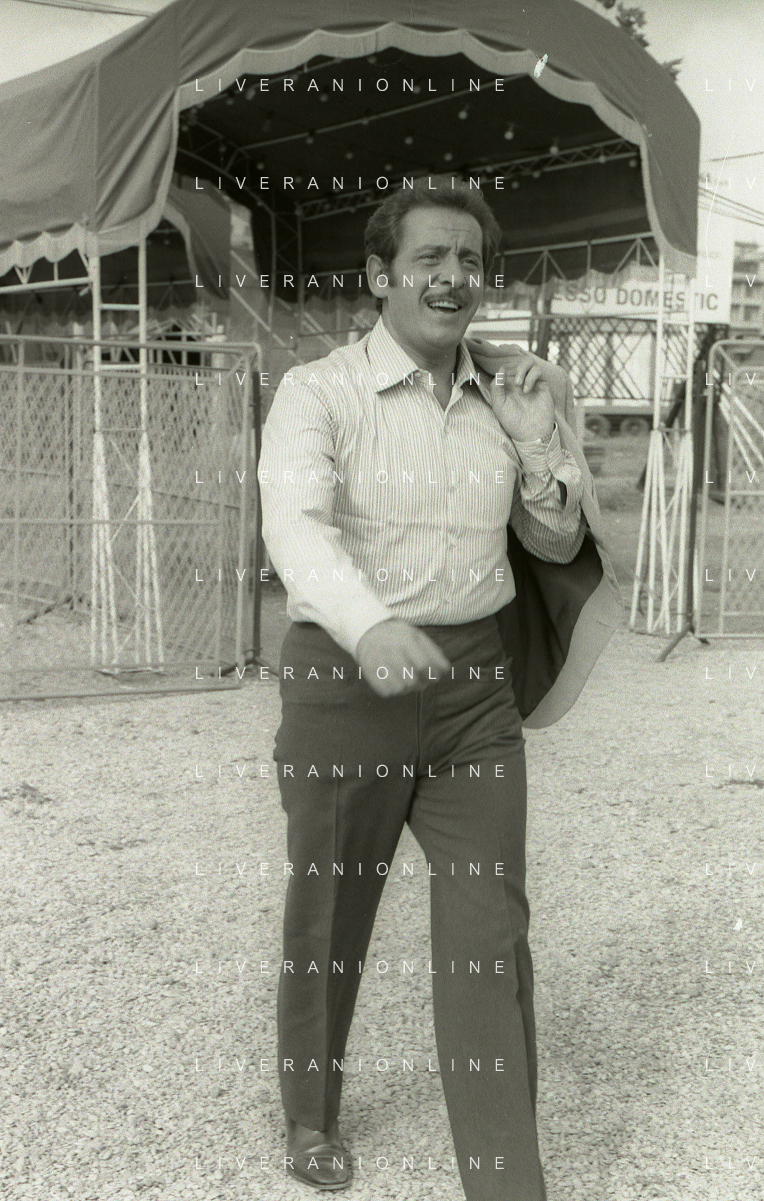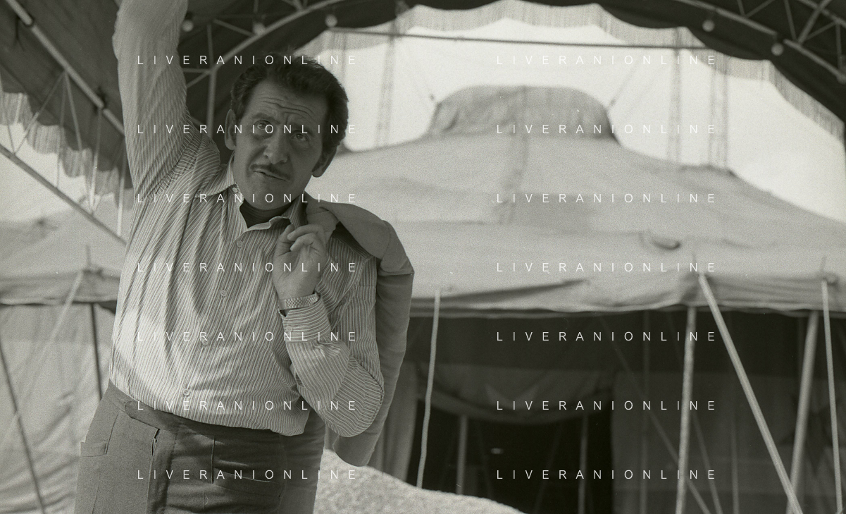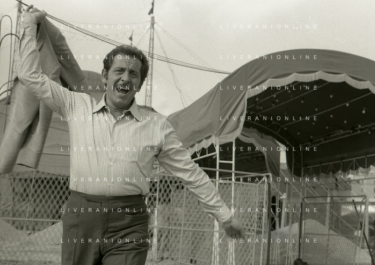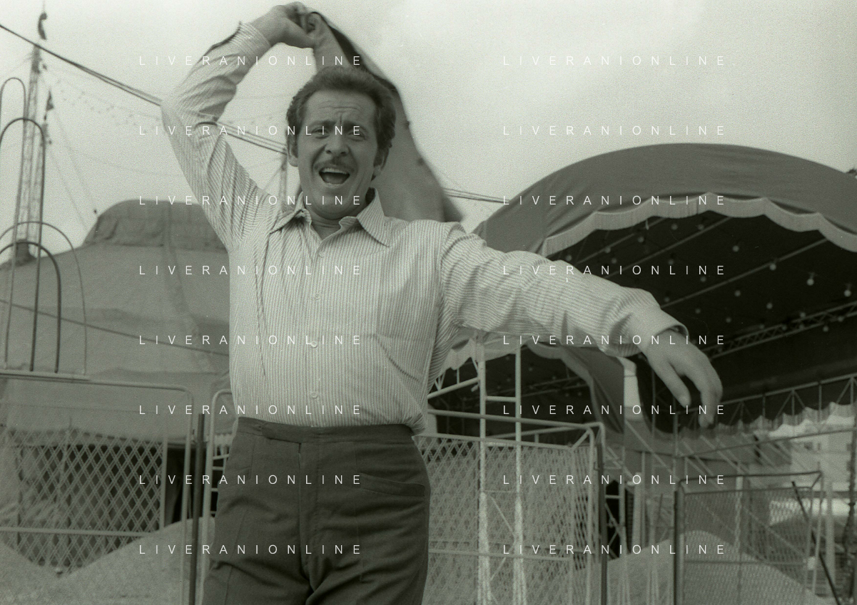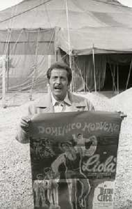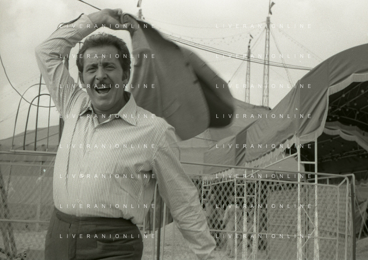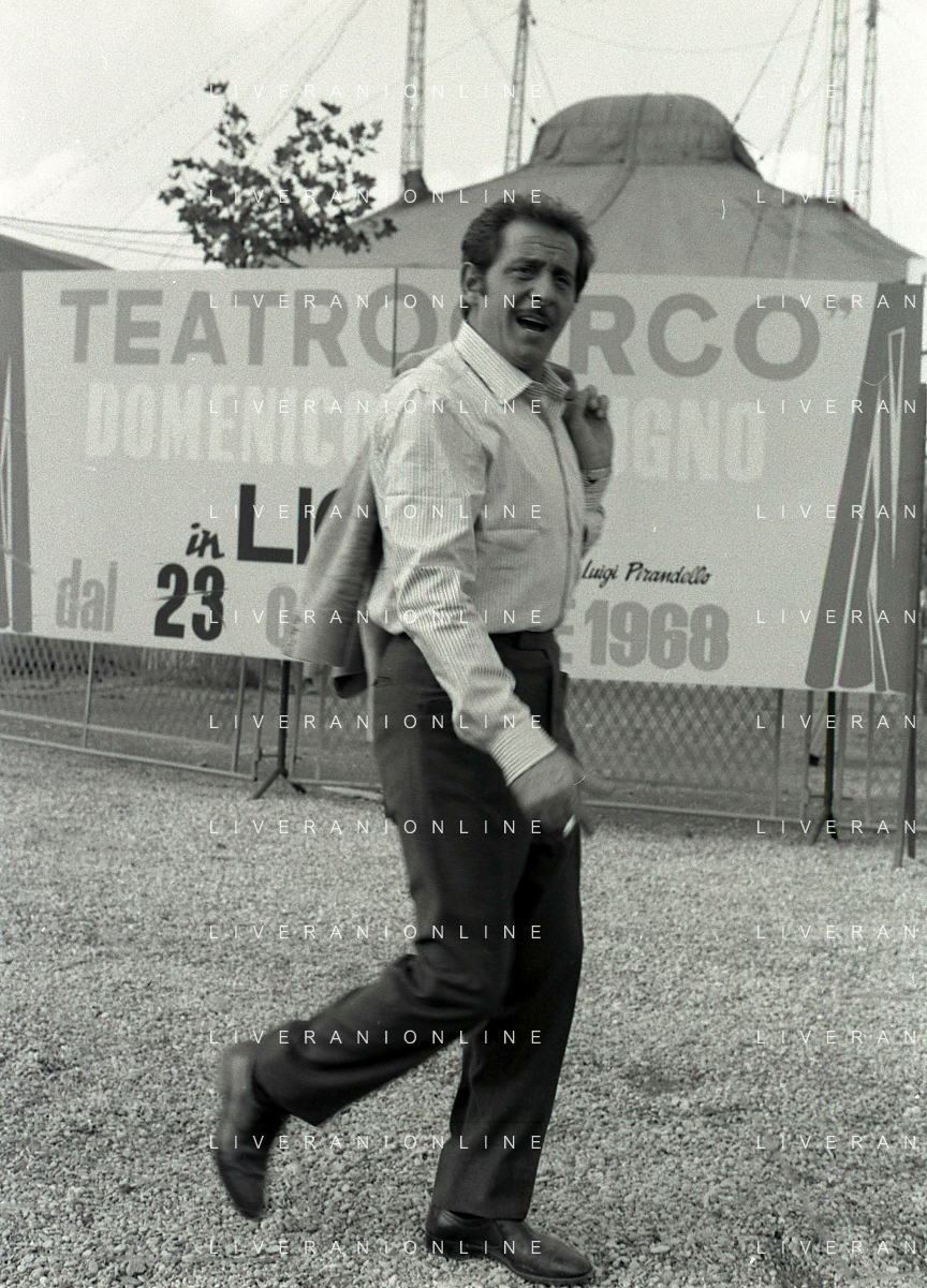NEG-RETROSPETTIVA DOMENICO MODUGNO CANTANTE NELLA FOTO DOMENICO MODUGNO NEL 1968 E IL SUO CIRCO TEATRO AG ALDO LIVERANI SAS