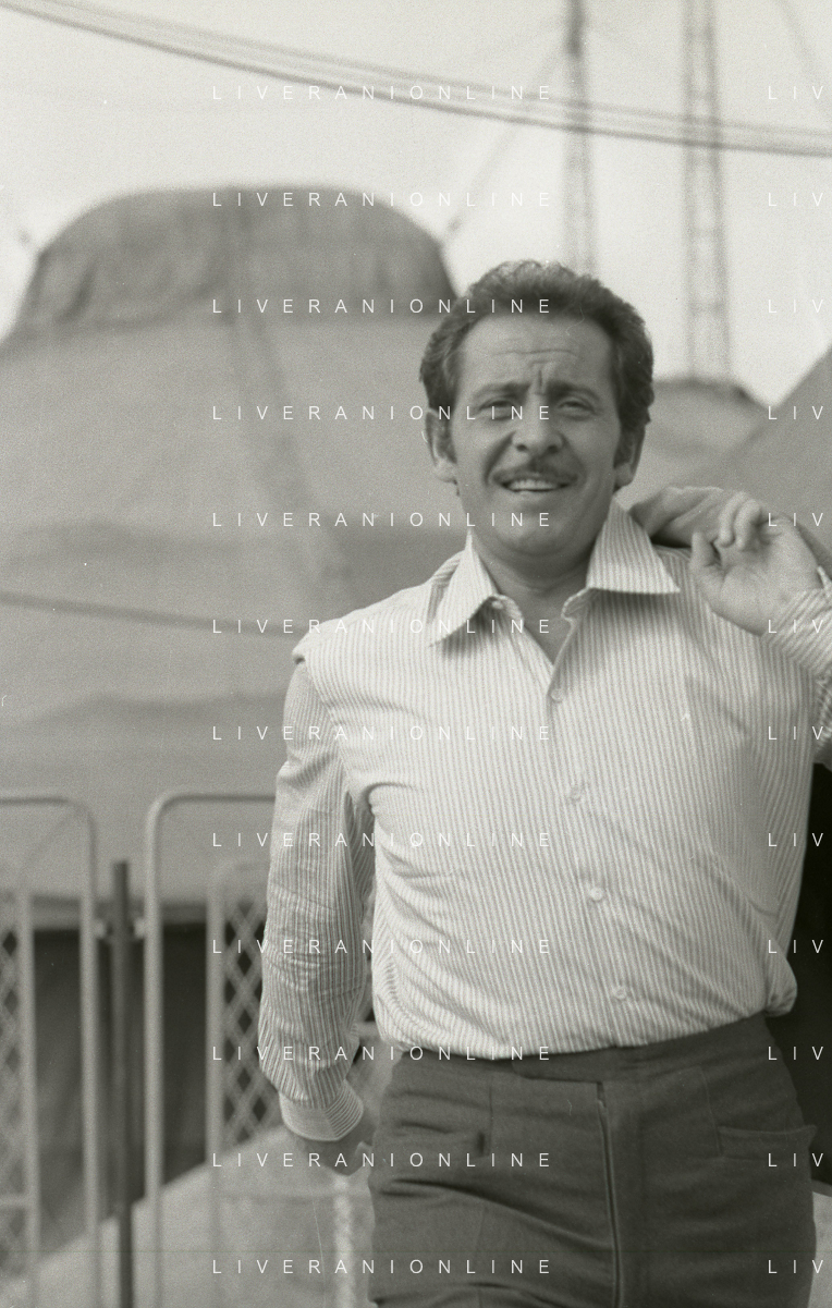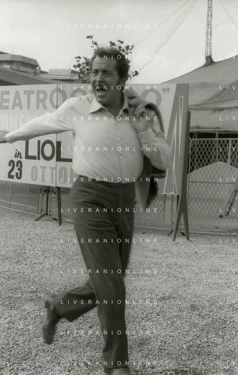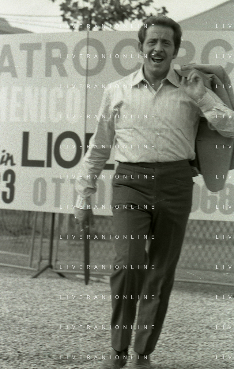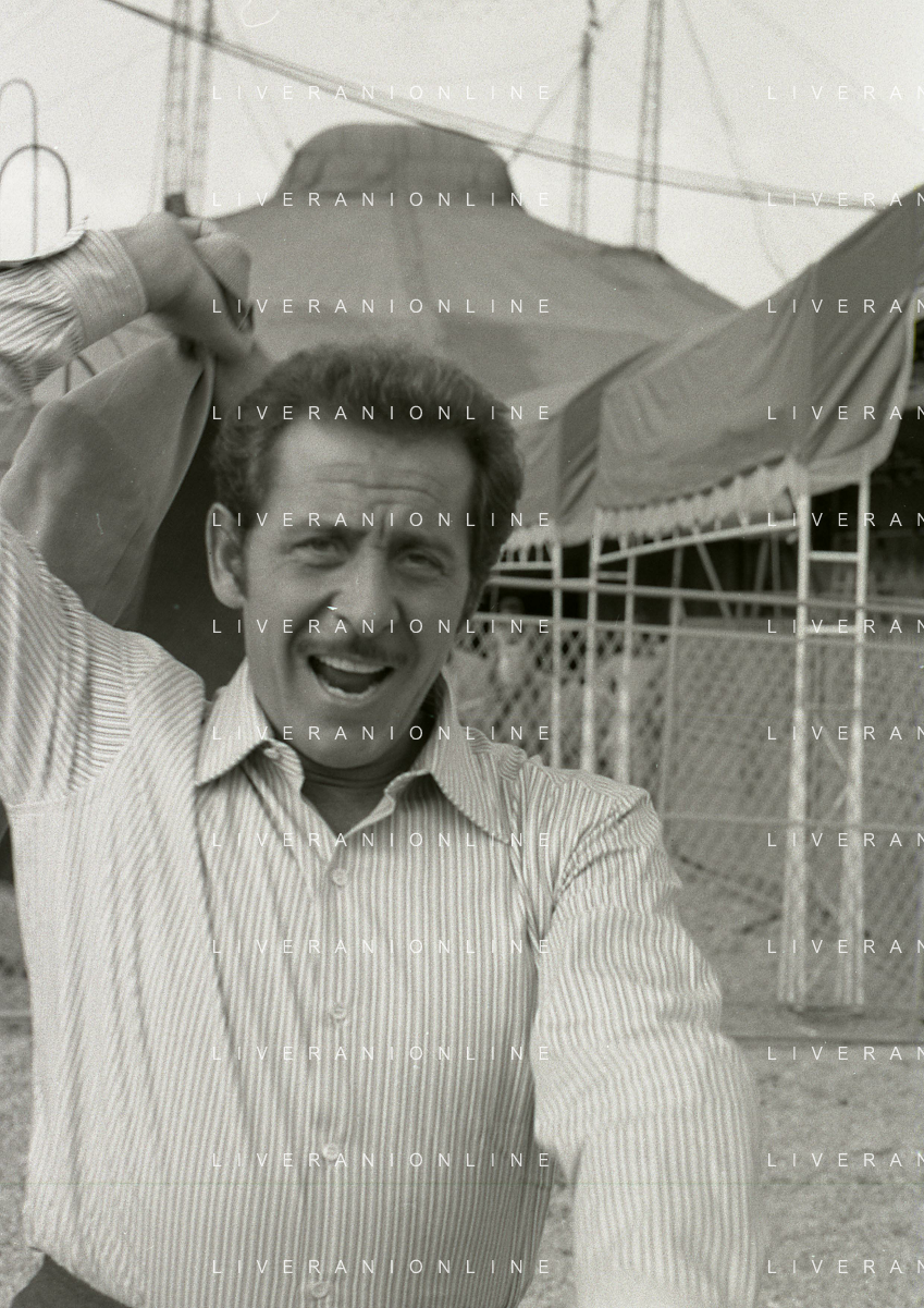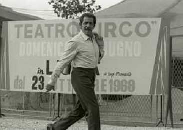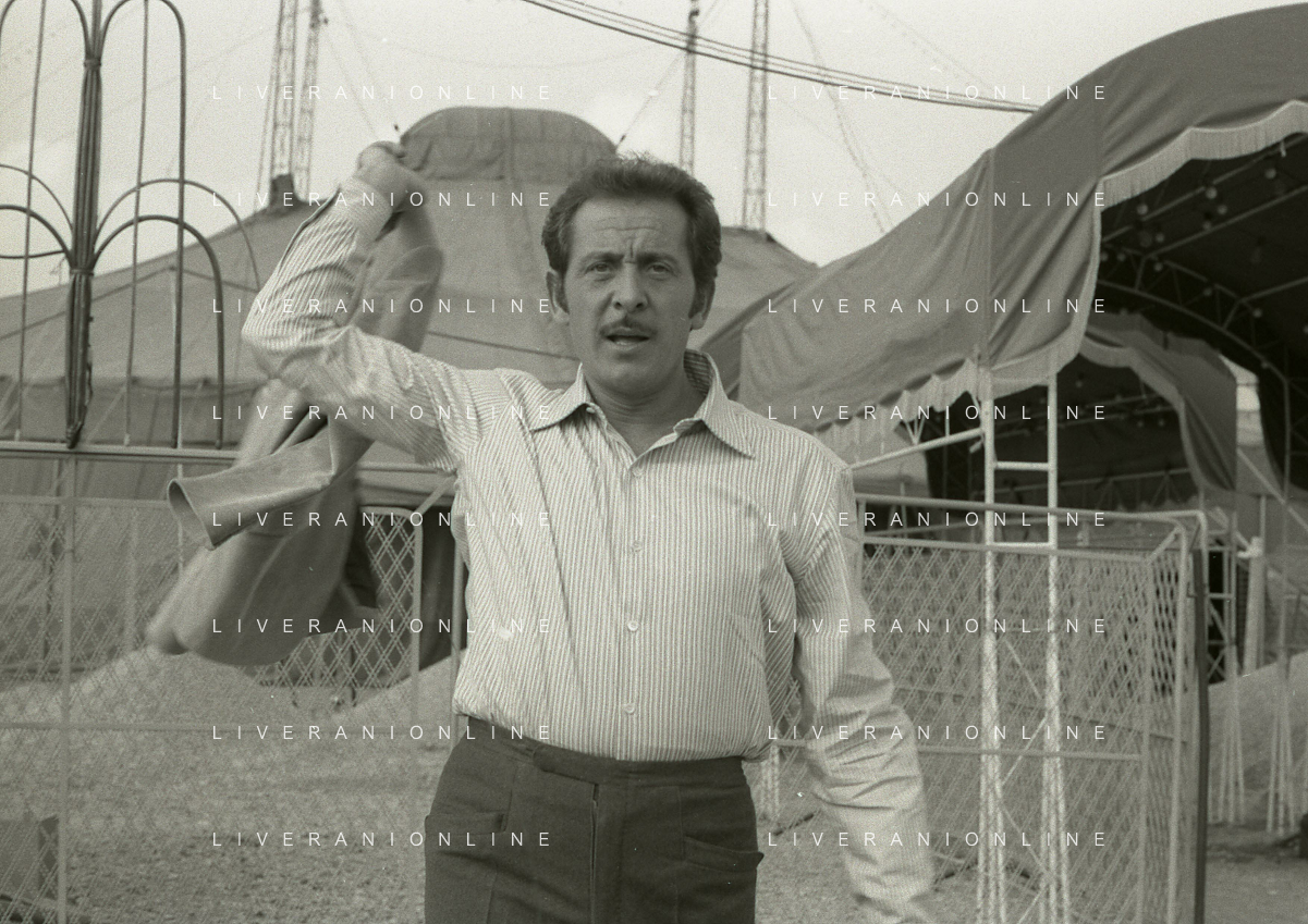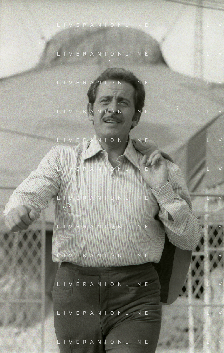 NEG-RETROSPETTIVA DOMENICO MODUGNO CANTANTE NELLA FOTO DOMENICO MODUGNO NEL 1968 E IL SUO CIRCO TEATRO AG ALDO LIVERANI SAS