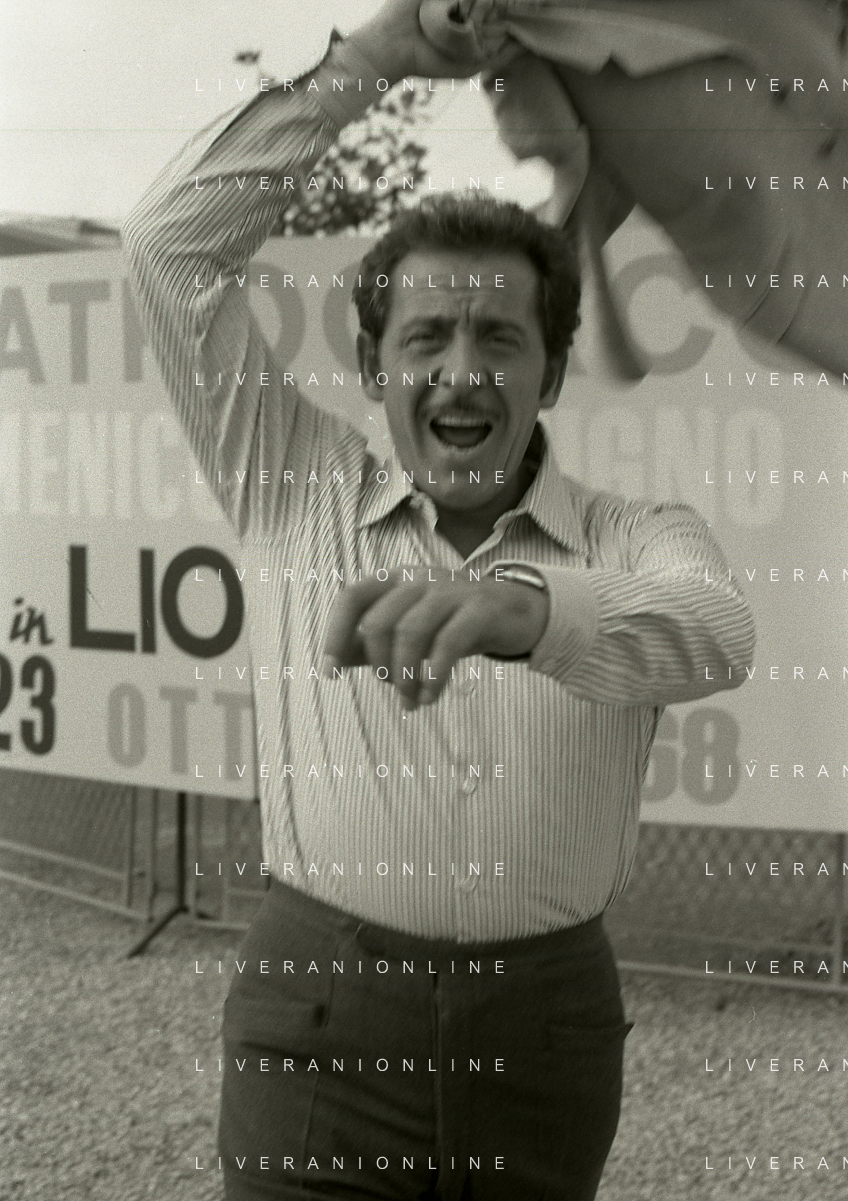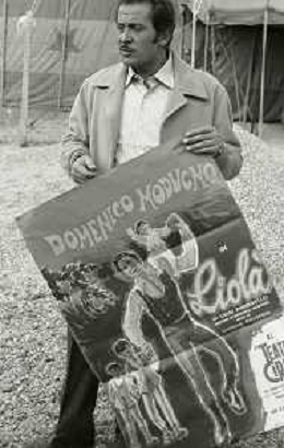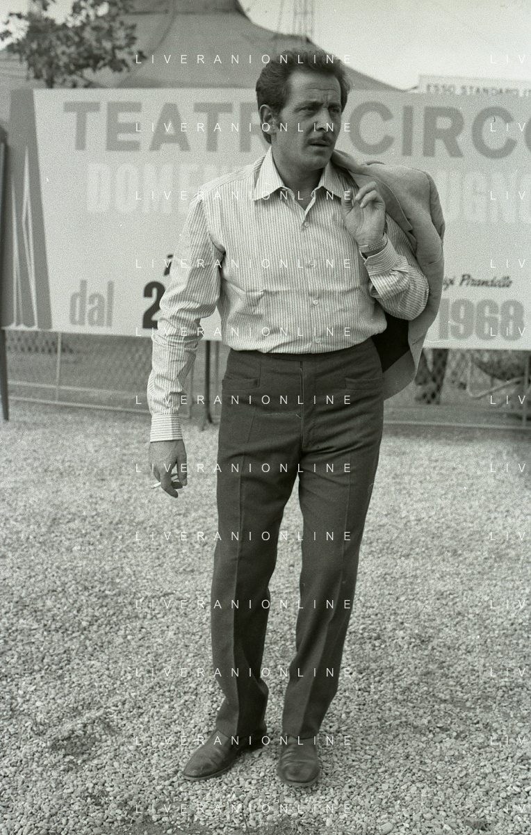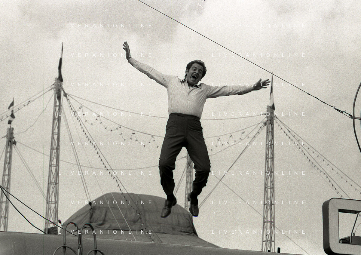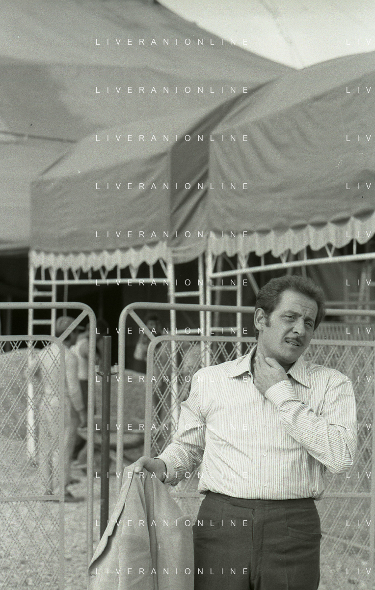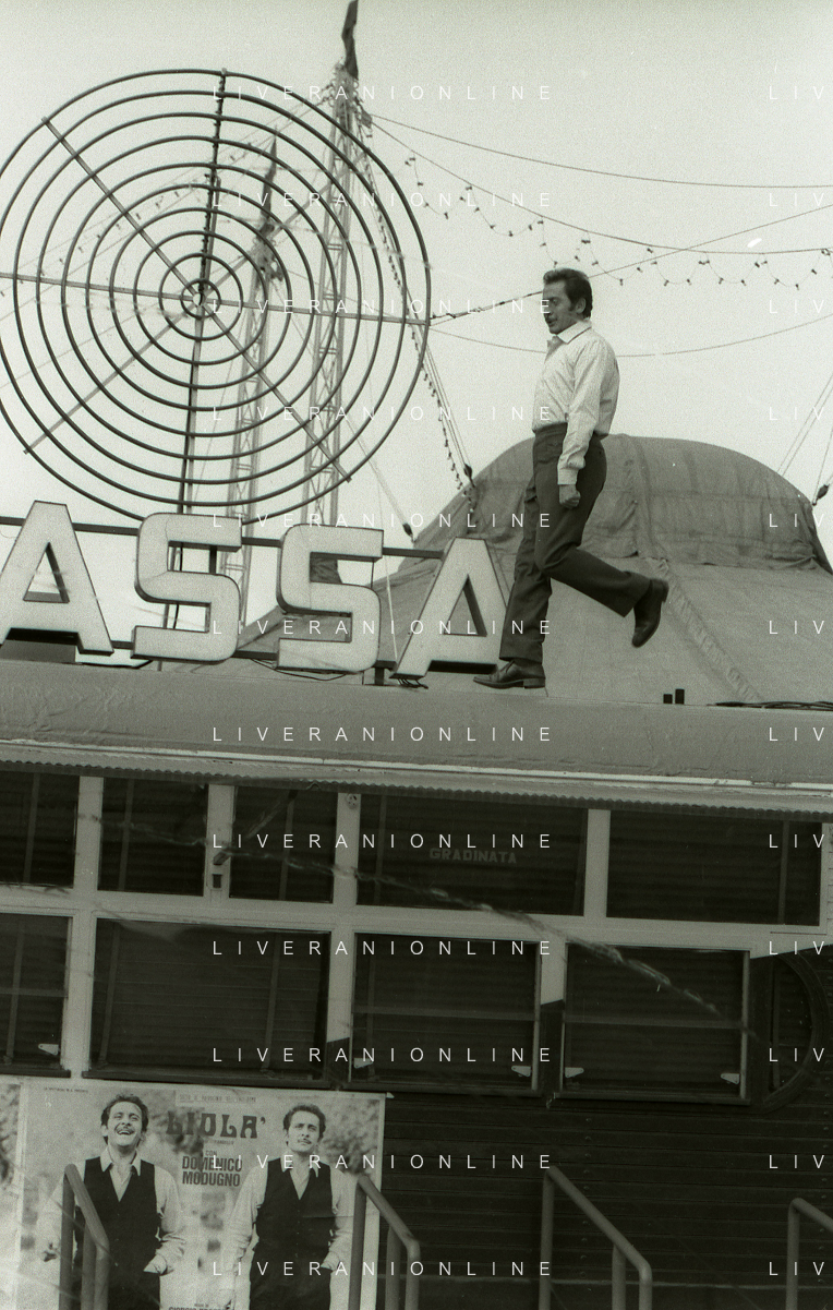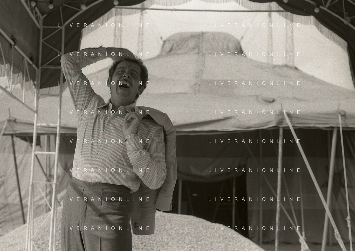 NEG-RETROSPETTIVA DOMENICO MODUGNO CANTANTE NELLA FOTO DOMENICO MODUGNO NEL 1968 E IL SUO CIRCO TEATRO AG ALDO LIVERANI SAS