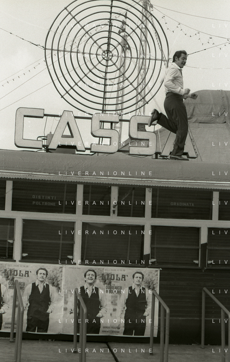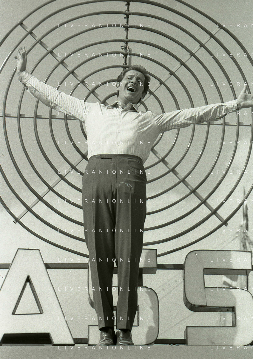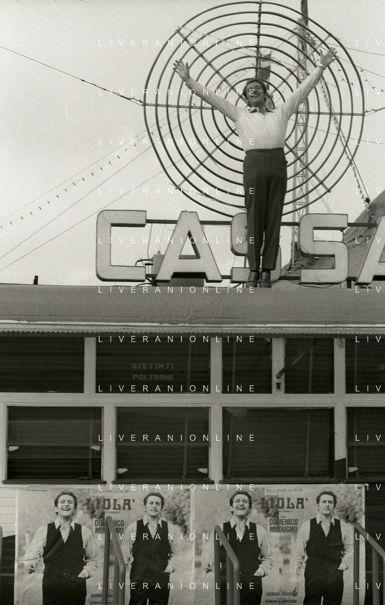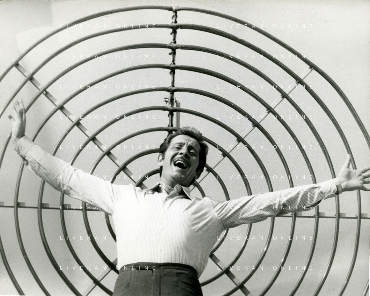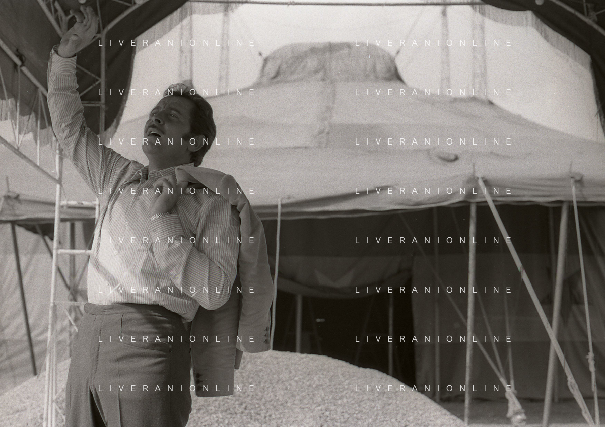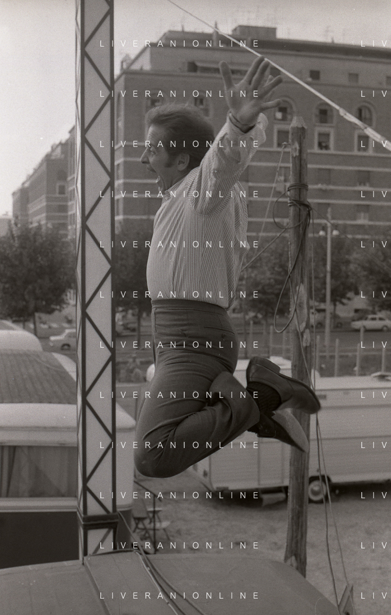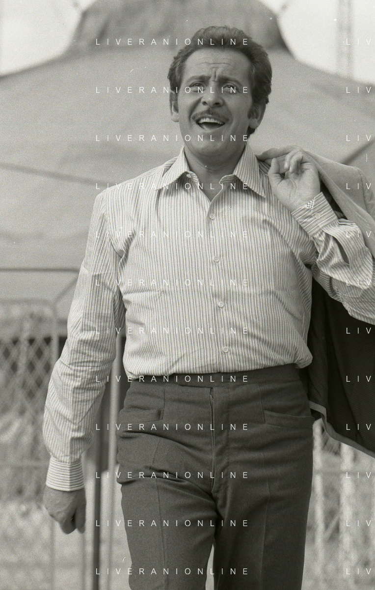 NEG-RETROSPETTIVA DOMENICO MODUGNO CANTANTE NELLA FOTO DOMENICO MODUGNO NEL 1968 E IL SUO CIRCO TEATRO AG ALDO LIVERANI SAS