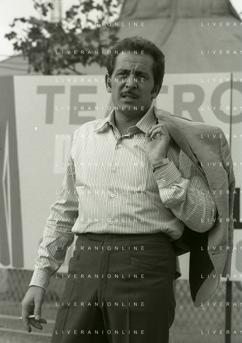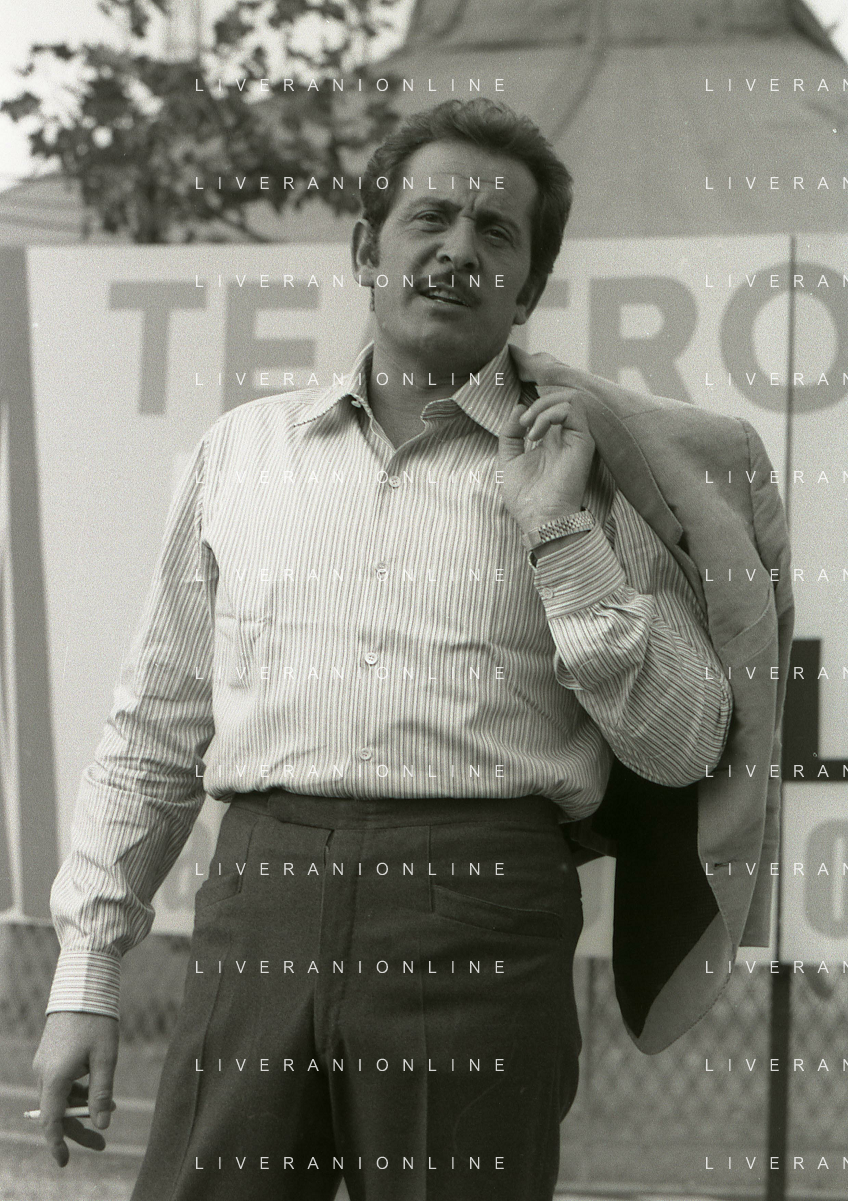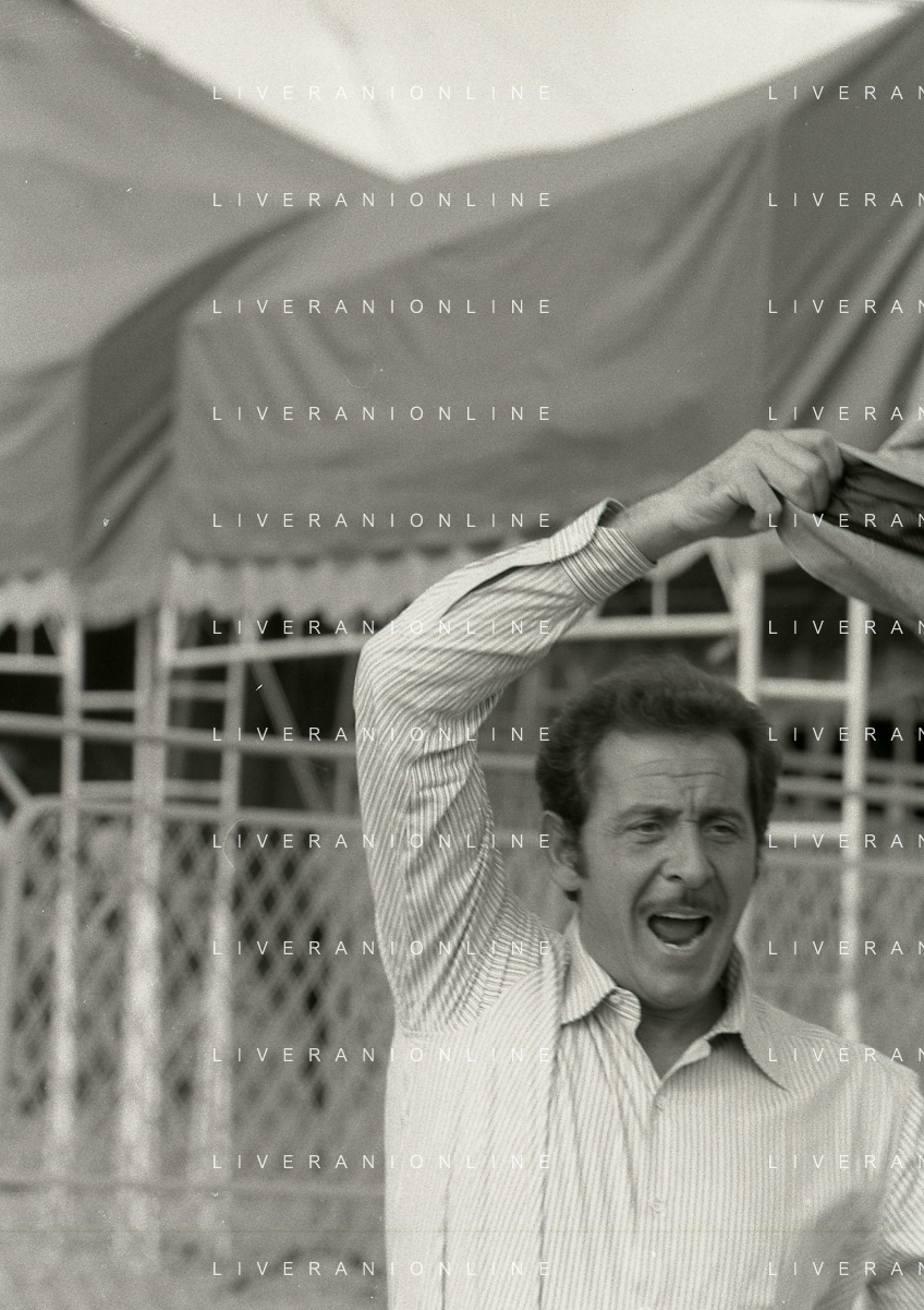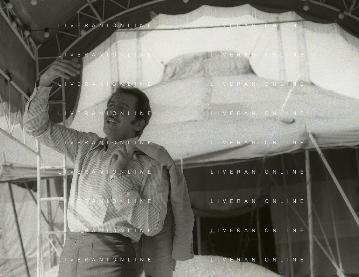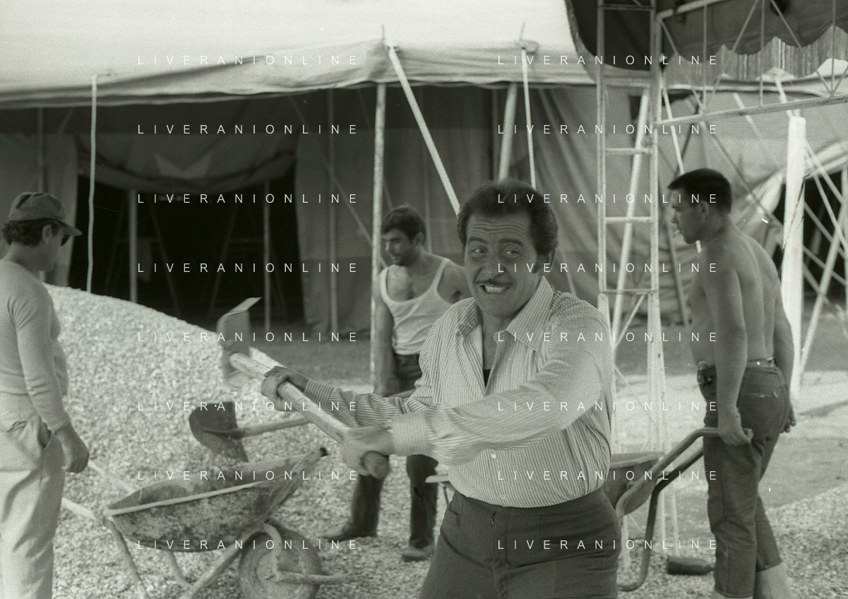 NEG-RETROSPETTIVA DOMENICO MODUGNO CANTANTE NELLA FOTO DOMENICO MODUGNO NEL 1968 E IL SUO CIRCO TEATRO AG ALDO LIVERANI SAS