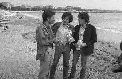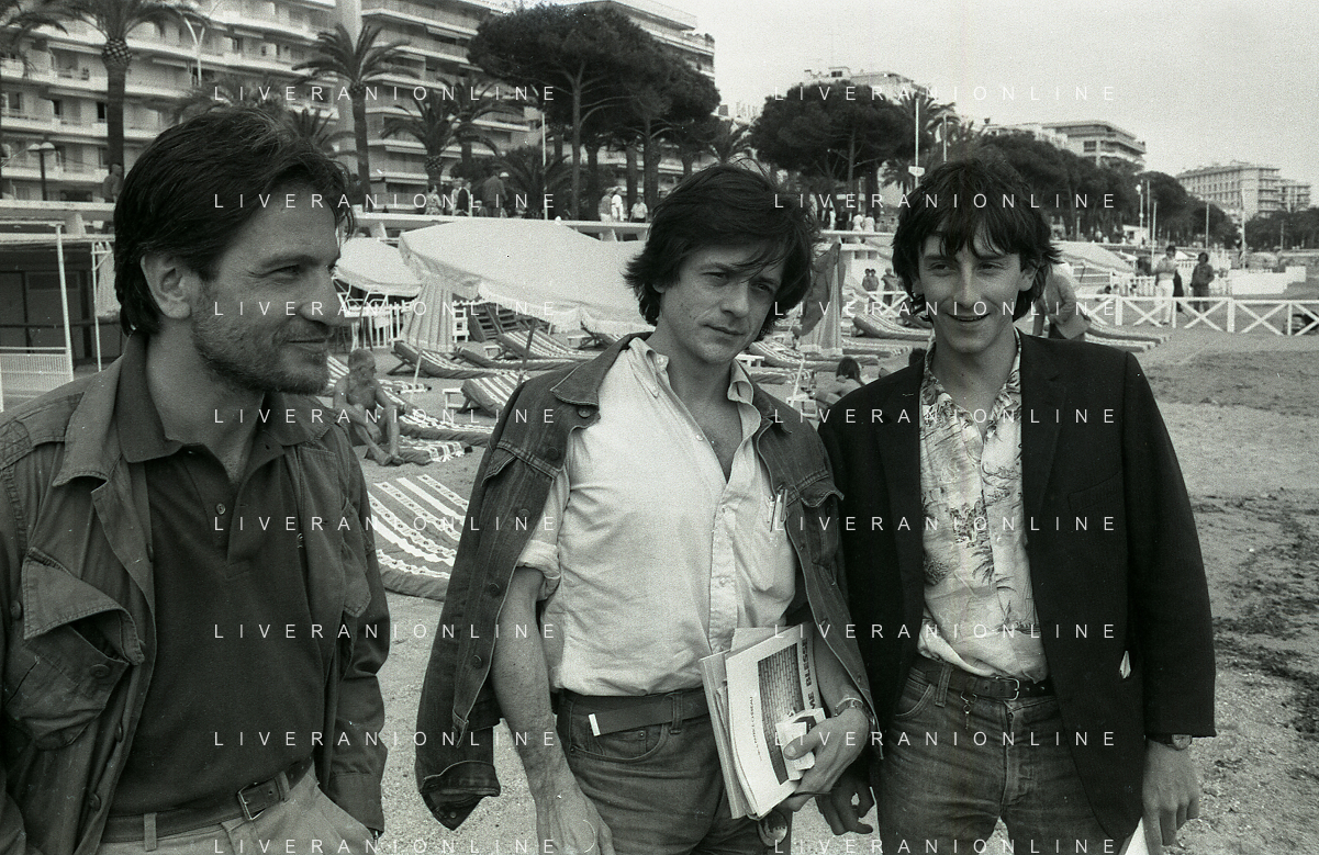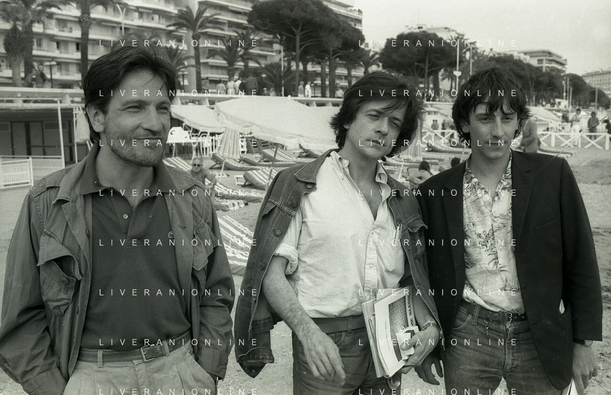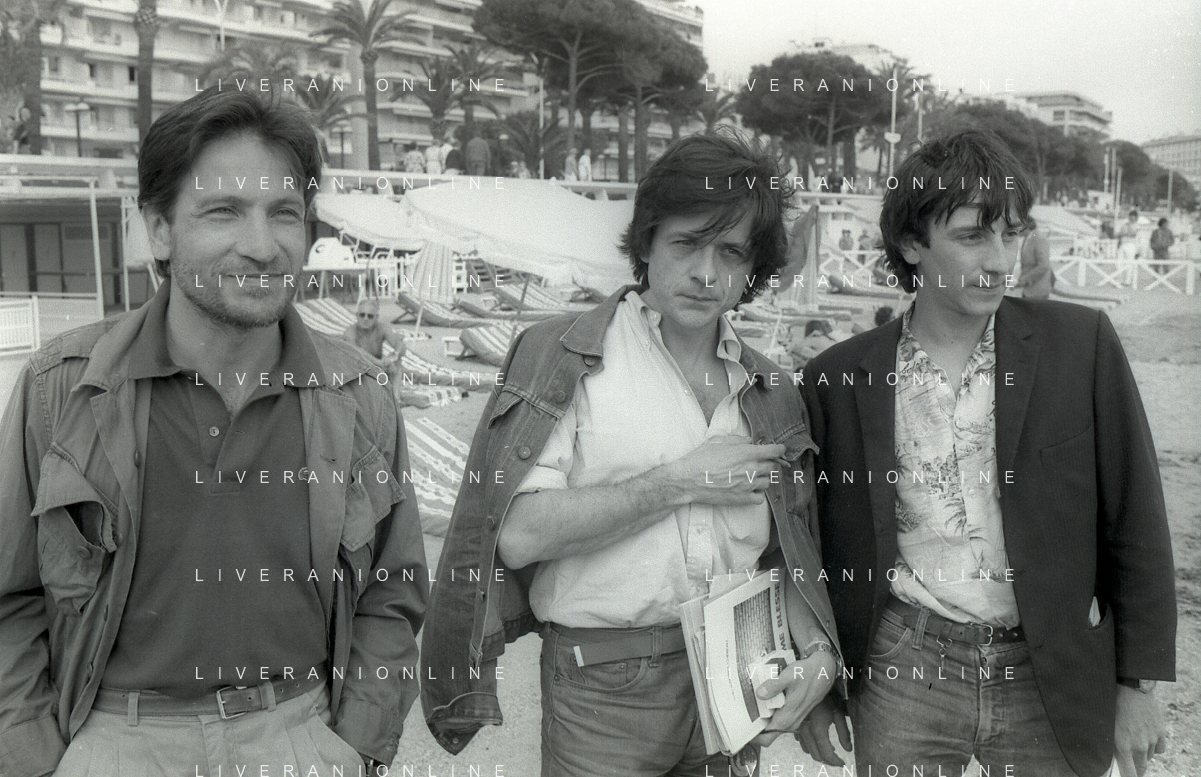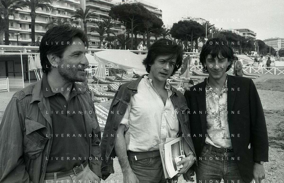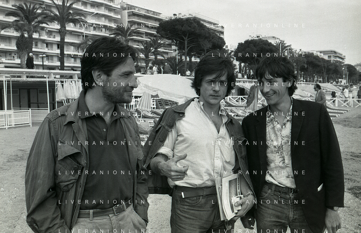 NEG-RETROSPETTIVA VITTORIO MEZZOGIORNO ATTORE NELLA FOTO VITTORIO MEZZOGIORNO CON JEAN HUGUES ANGLADE E PATRICE CHEREAU A CANNES NELL'ANNO 1983 AG ALDO LIVERANI SAS S