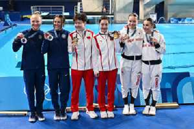Olimpiadi Parigi 2024 nella foto il podio, da SX la coppia statunitense, Sarah Bacon e Kassidy Cook, seconde, la coppia cinese, Yani Chang e Yiwen Chen, prime, e la coppia britannica, Yasmin Harper e Scarlett Mew Jensen, terze Parigi (FRA) 27-07-2024 Finale della gara femminile di tuffi dal trampolino 3 metri sincronizzato foto Roberto Garavaglia/Agenzia Aldo Liverani sas