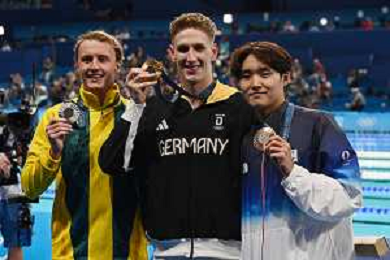 Olimpiadi Parigi 2024 - nuoto Nuoto finale 400 m stile libero maschile nella foto Lukas Maertens (GER) vince la medaglia d'oro, a SX Elijah Winnington (AUS), secondo, e Woomin Kim (KOR), terzo Parigi 27-07-2024 Arena Parigi La Defense foto Roberto Garavaglia/Agenzia Aldo Liverani sas