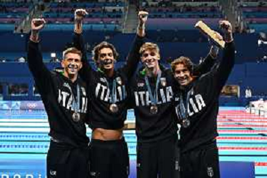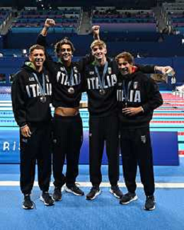 Olimpiadi Parigi 2024 - nuoto Nuoto finale 4x100m stile libero maschile nella foto Italia con la medaglia di bronzo Parigi 27-07-2024 Arena Parigi La Defense foto Roberto Garavaglia/Agenzia Aldo Liverani sas