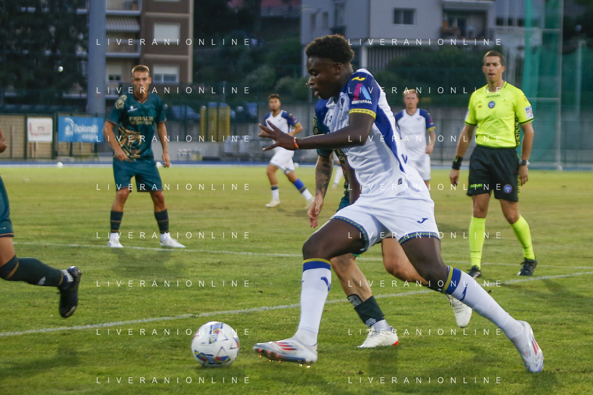 Alphadjo Cissè of Hellas Verona battle for the ball during Hellas Verona FC vs Feralpisalò FC, 4° Test Match, at stadio "Quercia" in Rovereto (TN), on July 27, 2024. (Photo by Davide Casentini)/AGENZIA ALDO LIVERANI SAS