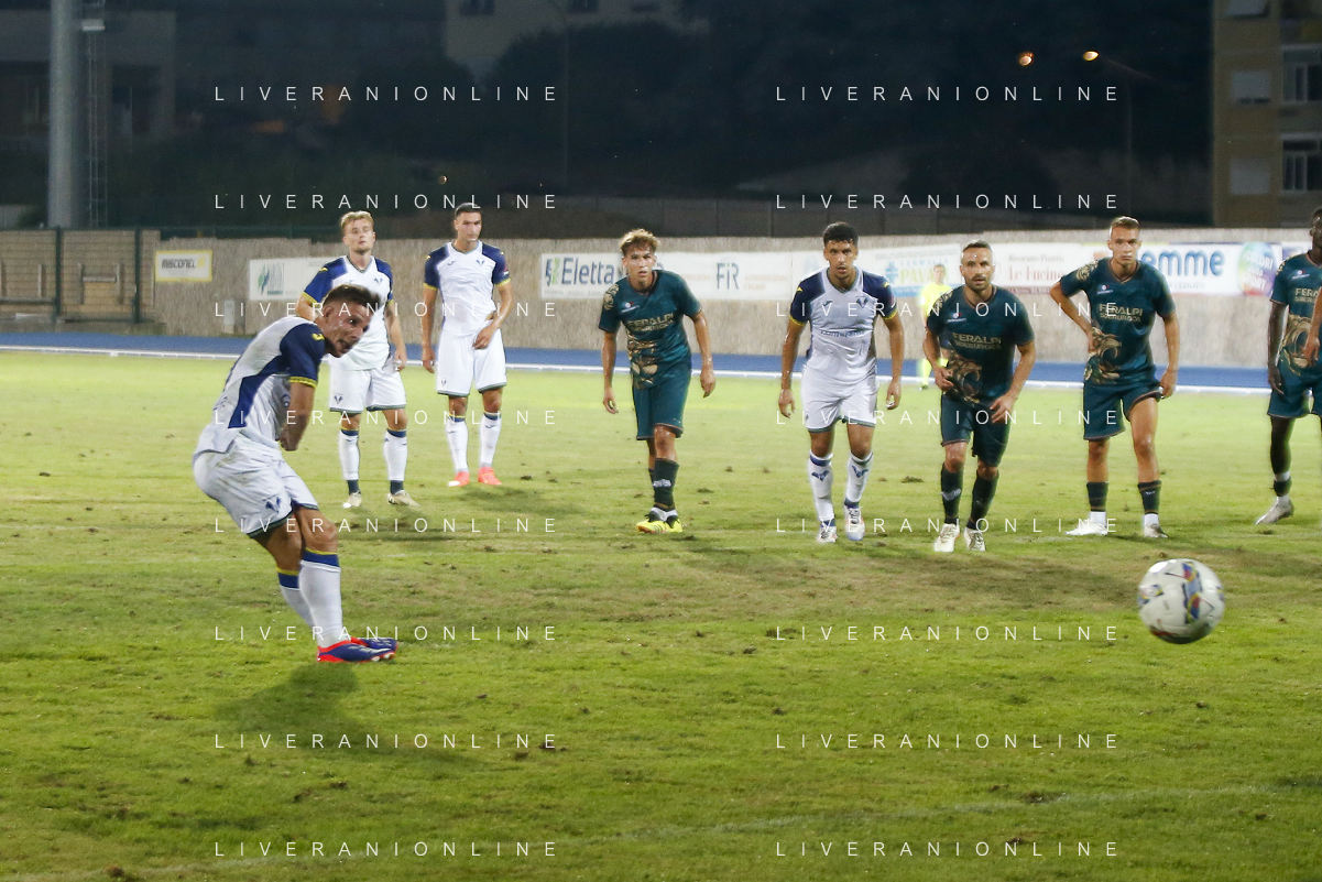 Diego Coppola of Hellas Verona play the ball during Hellas Verona FC vs Feralpisalò FC, 4° Test Match, at stadio "Quercia" in Rovereto (TN), on July 27, 2024. (Photo by Davide Casentini)/AGENZIA ALDO LIVERANI SAS