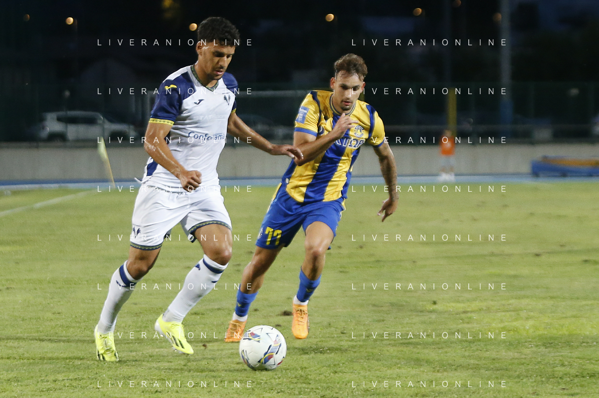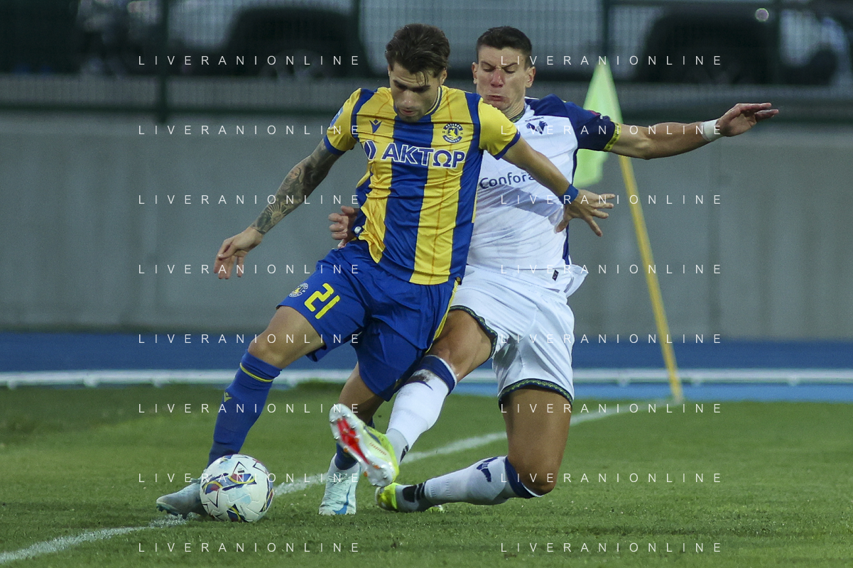 Giangiacomo Magnani of Hellas Verona FC battle for the ball during Hellas Verona FC vs Asteras Tripolis FC, 5° Test Match, at stadio "Quercia" in Rovereto (TN), on August 03, 2024. (Photo by Davide Casentini)/AGENZIA ALDO LIVERANI SAS
