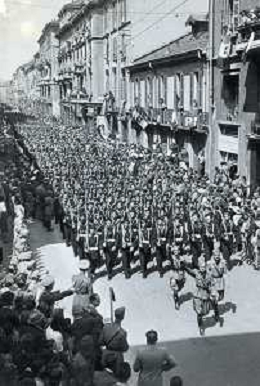 ST-ARCHIVIO ARGO PERIODO FASCISMO LOMBARDIA E MILANO NELLA FOTO 08-04-1939 L'ARRIVO A MILANO DELLA MILIZIA UNIVERSITARIA DOPO CIRCA UN MESE DICAMPO SOPRA LA CITTA' DI ERBA FOTO ARGO-PROV ARCH CONTROLUCE-AG ALDO LIVERANI SAS