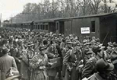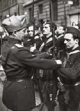 ST-ARCHIVIO ARGO PERIODO FASCISMO LOMBARDIA E MILANO NELLA FOTO LA PARTENZA DA MILANO DEL BATTAGLIONE DEGLI SQUADRISTI E DEI VOLONTARI PER IL FRONTE DELLA GUERRA DI SPALLE IL GEN.PRETI AMMINO DELLA BANDIERA 07-03-1941 FOTO ARGO-PROV ARCH CONTROLUCE-AG ALDO LIVERANI SAS